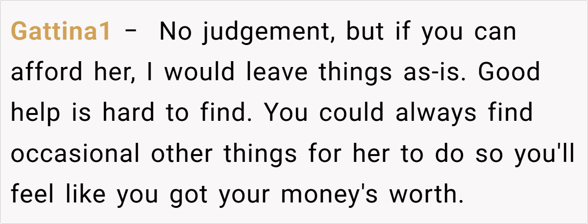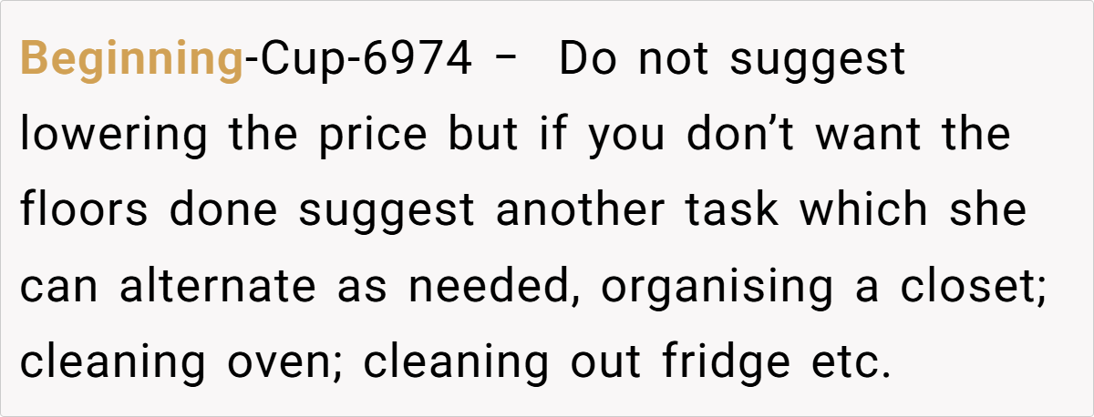 - Repurpose Tasks, Not Pay: Redirect her efforts to deep-cleaning neglected areas (e.g., ovens, windows, organizing closets).