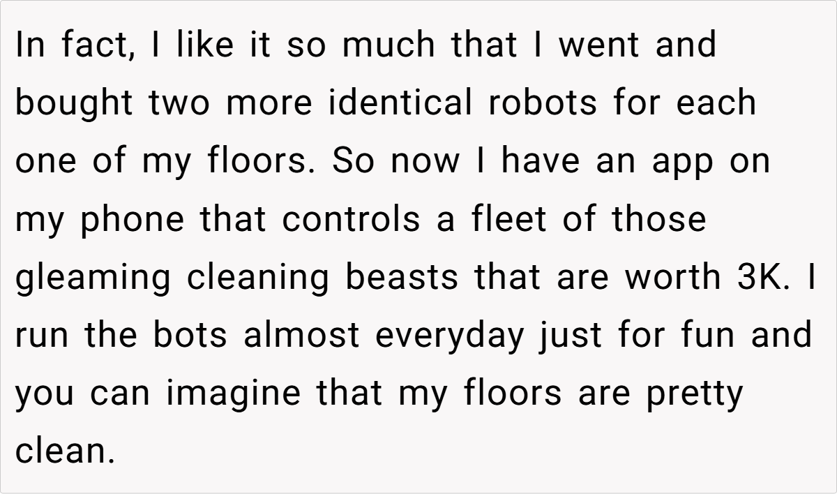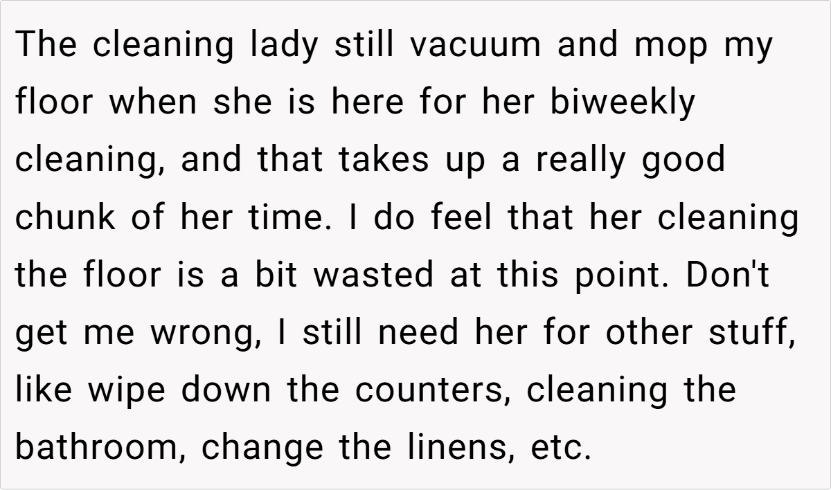The homeowner, who lives in a three-level house, has employed the same cleaning lady for five years. She followed them from a condo to their current home, doubling her rate to $200 biweekly for the larger space. Though reliable and efficient, her floor-cleaning tasks now overlap with three advanced robot vacuums (worth $3,000) that clean daily. The homeowner wonders if reducing her pay or frequency makes sense—or if it’s an unfair move against a trusted worker.