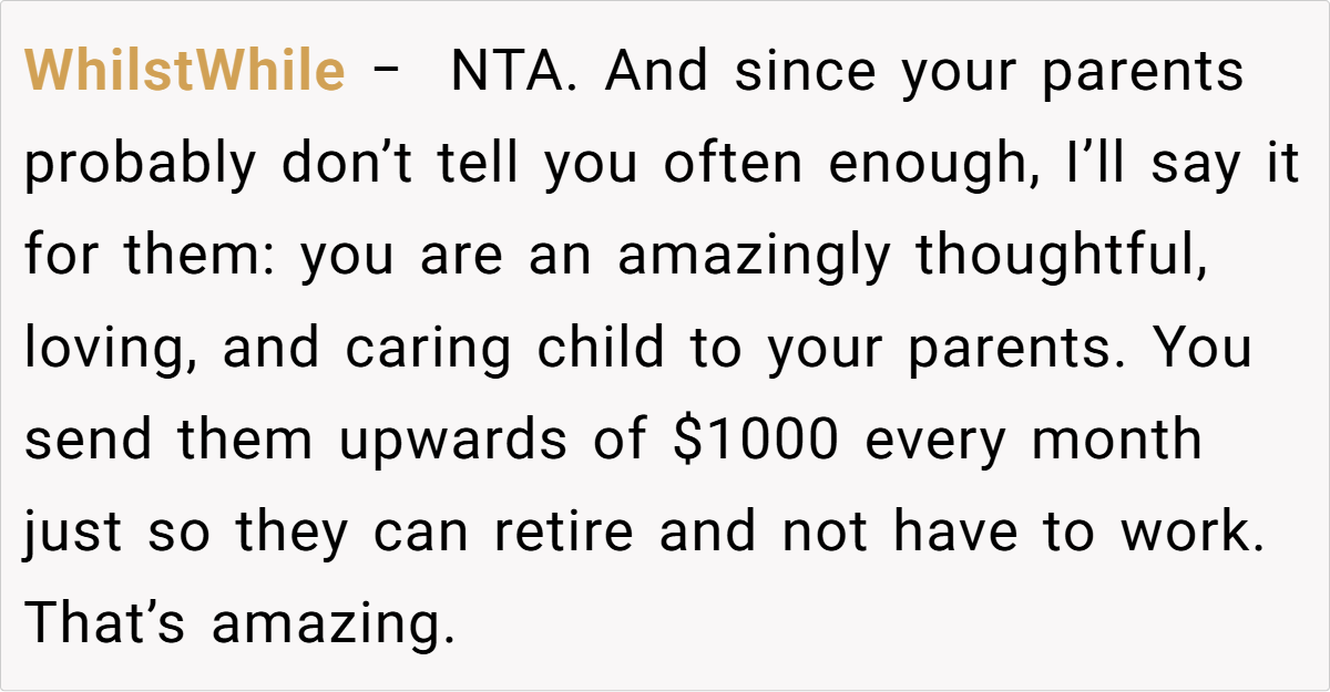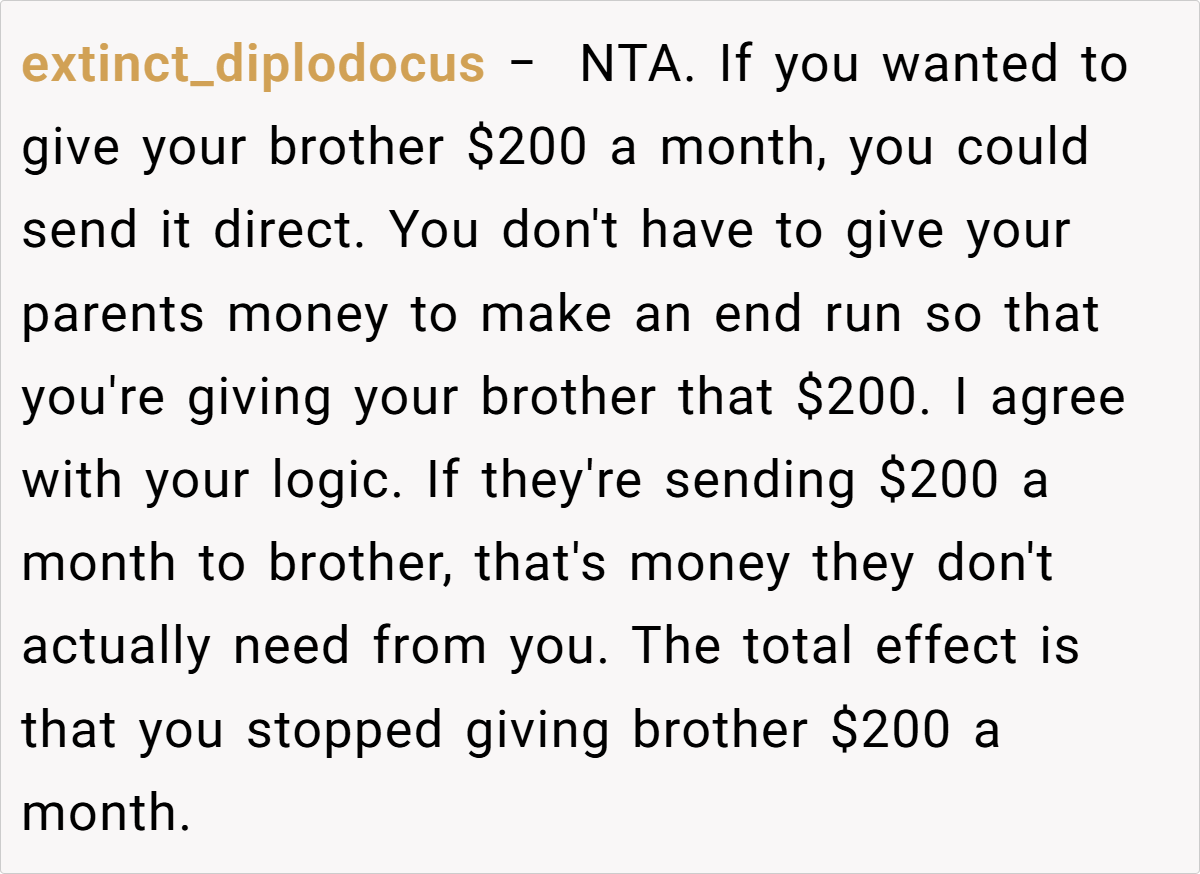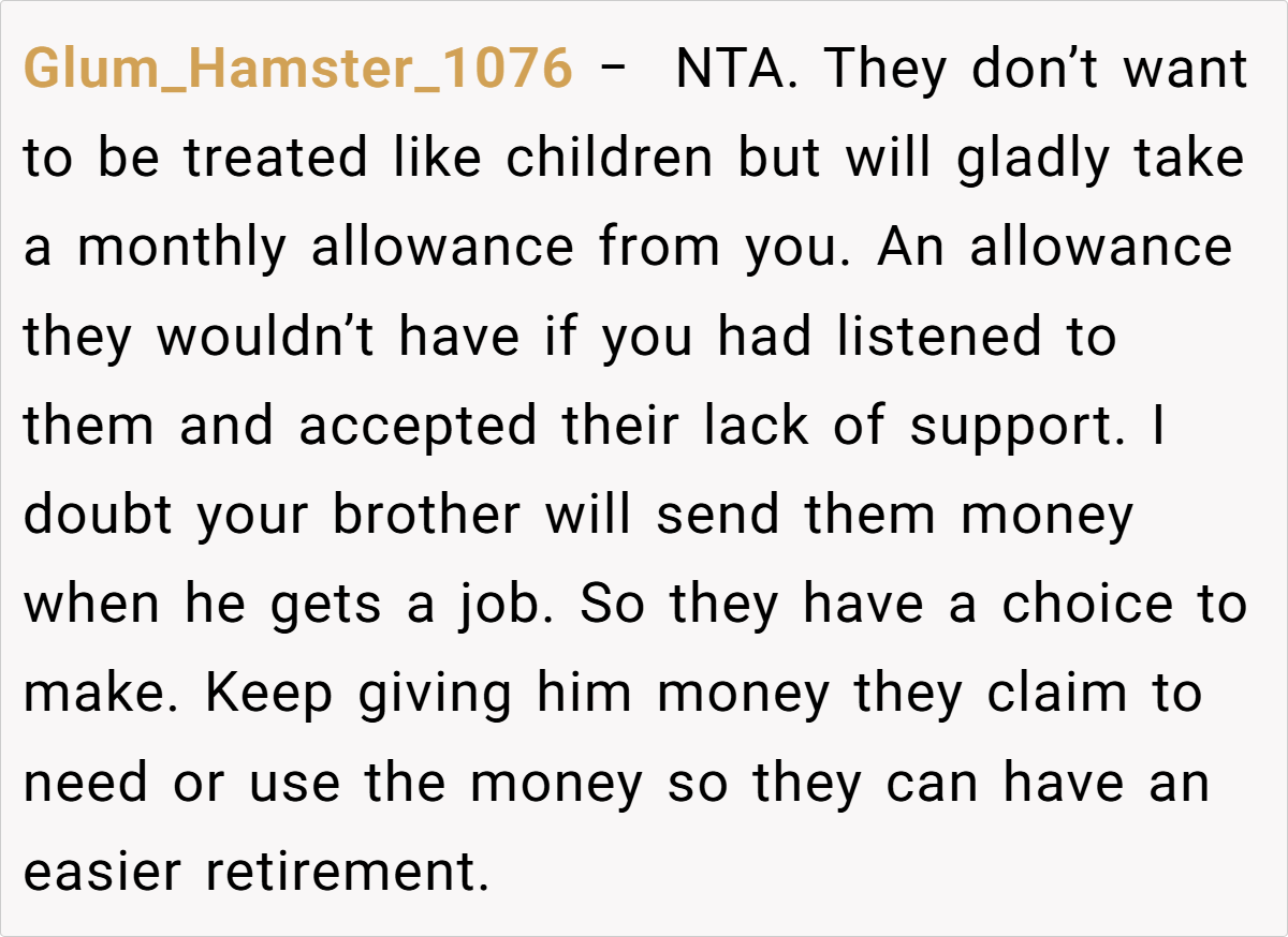 Across Reddit, many users applaud the OP for her pragmatic approach. Commenters noted that reducing her parents’ monthly allowance isn’t about being unsupportive—it’s about ensuring that funds meant for a secure retirement aren’t being misused. They emphasized that if the brother needs money, he should receive it directly rather than siphoning off money intended for his parents’ well-being. In essence, the community agrees that setting financial boundaries is a healthy and responsible choice.