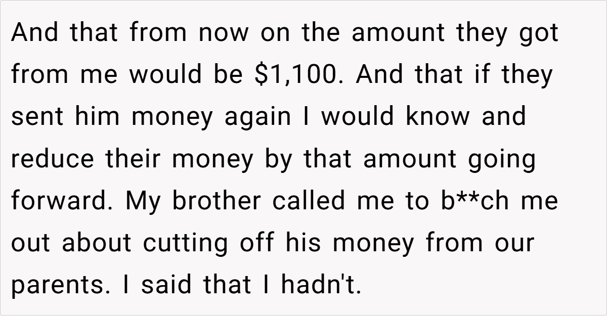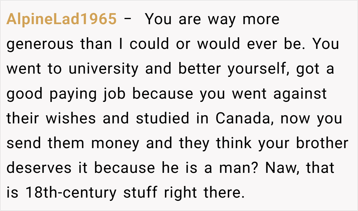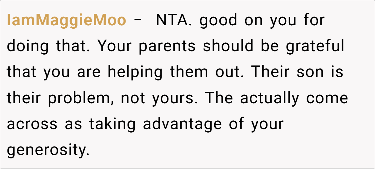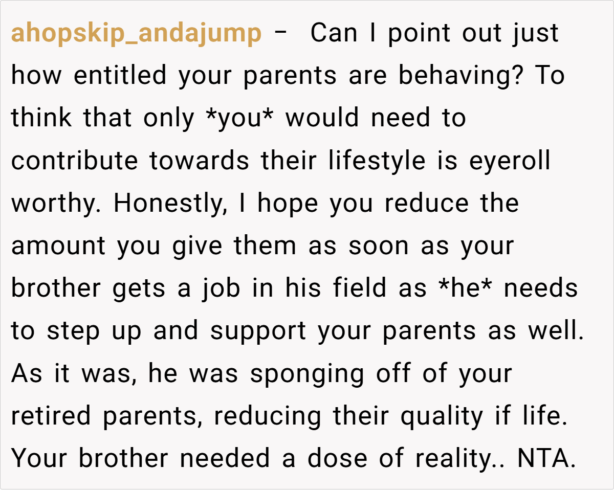 Across Reddit, many users applaud the OP for her pragmatic approach. Commenters noted that reducing her parents’ monthly allowance isn’t about being unsupportive—it’s about ensuring that funds meant for a secure retirement aren’t being misused. They emphasized that if the brother needs money, he should receive it directly rather than siphoning off money intended for his parents’ well-being. In essence, the community agrees that setting financial boundaries is a healthy and responsible choice.