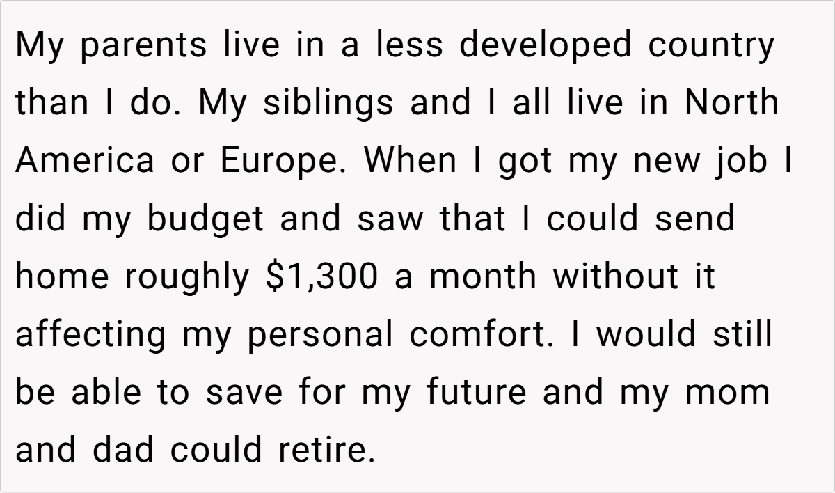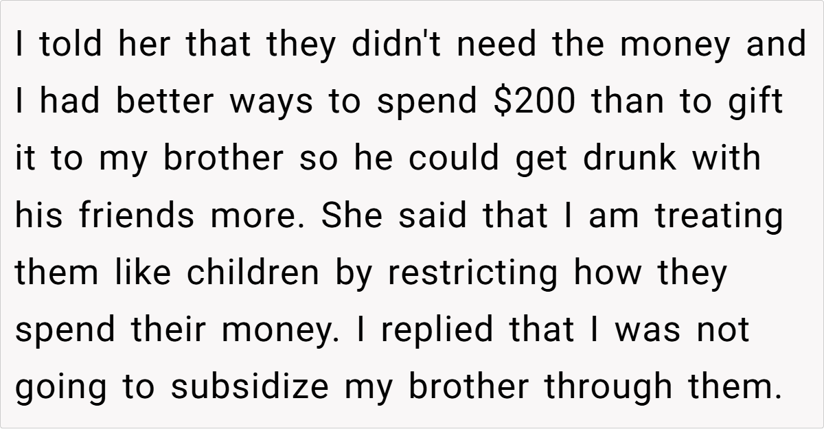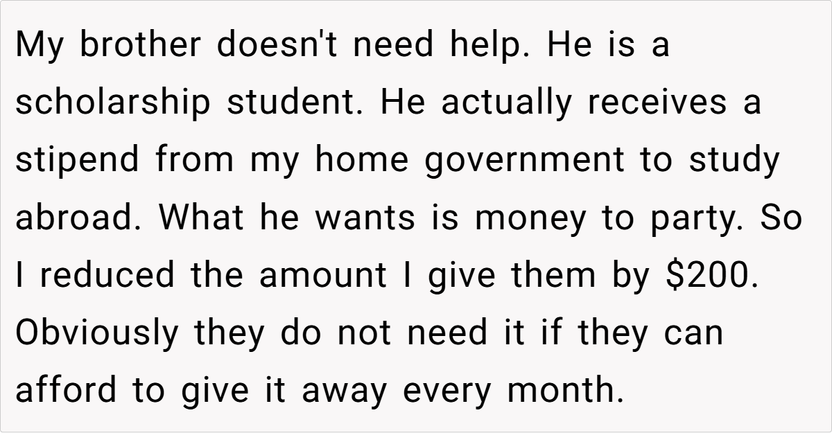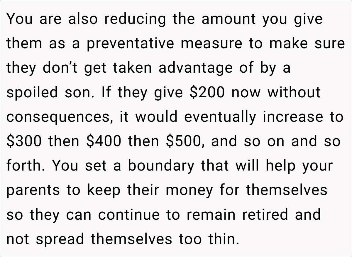 Moreover, establishing boundaries does not equate to being unloving or ungrateful. On the contrary, it reflects a deep commitment to ensuring that financial support serves its intended purpose. The OP’s decision to cut the extra $200 is less about withholding help and more about safeguarding her parents’ long-term well-being. In many cases, failing to set limits can lead to financial strain, resentment, and even enable unhealthy habits among family members, as illustrated by her brother’s lavish spending on parties.