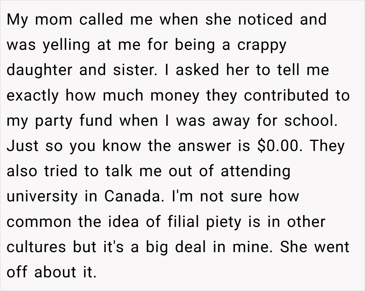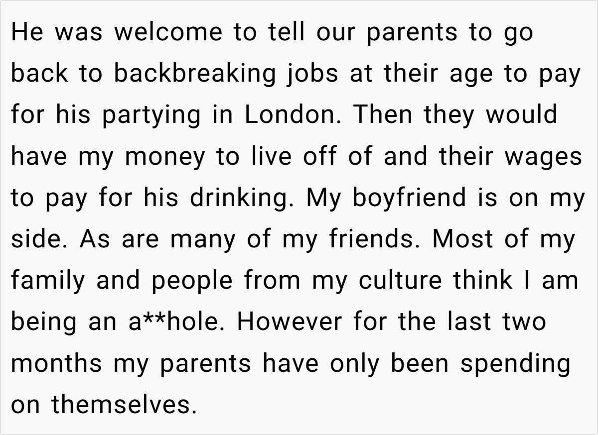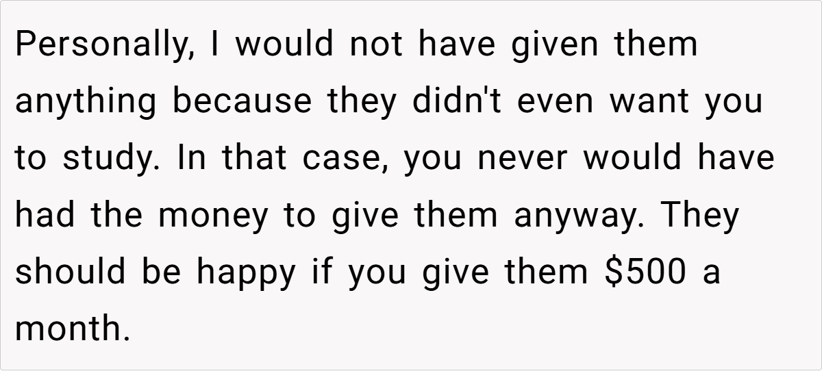 Moreover, establishing boundaries does not equate to being unloving or ungrateful. On the contrary, it reflects a deep commitment to ensuring that financial support serves its intended purpose. The OP’s decision to cut the extra $200 is less about withholding help and more about safeguarding her parents’ long-term well-being. In many cases, failing to set limits can lead to financial strain, resentment, and even enable unhealthy habits among family members, as illustrated by her brother’s lavish spending on parties.