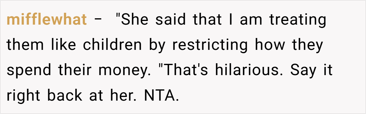 Others pointed out that while some may view her actions as harsh, the OP is merely enforcing a boundary that protects everyone’s interests in the long run. By taking control of her finances, she is sending a clear message: support is provided on her terms, not at the expense of enabling irresponsible behavior.