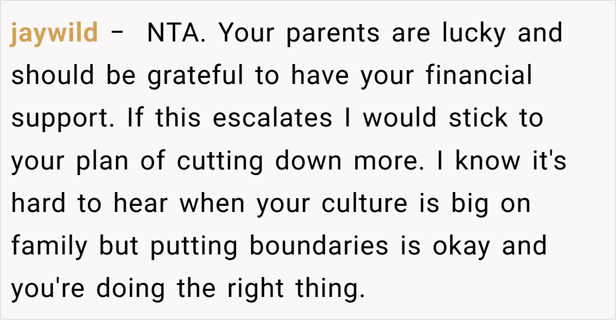 Setting clear financial boundaries with family is essential for protecting your future and encouraging responsibility. Financial advisor Dave Ramsey once said, “If you don’t set clear boundaries on your money, the money will control you.” This insight is especially relevant when family dynamics become entangled with cultural expectations and emotional obligations. In this case, the OP’s decision to withhold funds that are being misappropriated is a practical step toward ensuring that her parents’ retirement savings remain intact.