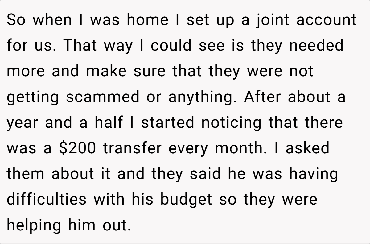 Navigating family finances can be challenging—especially when cultural expectations clash with modern financial independence. In this story, our OP discovered that after setting up a joint account to support her aging parents, a mysterious $200 monthly transfer was being redirected to her brother, who clearly doesn’t need the extra cash.
