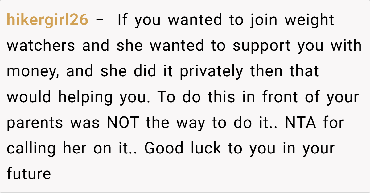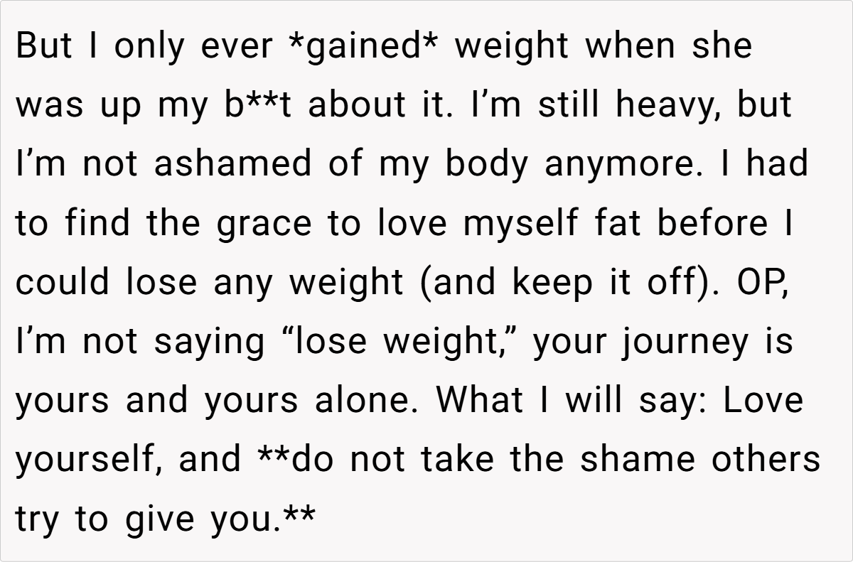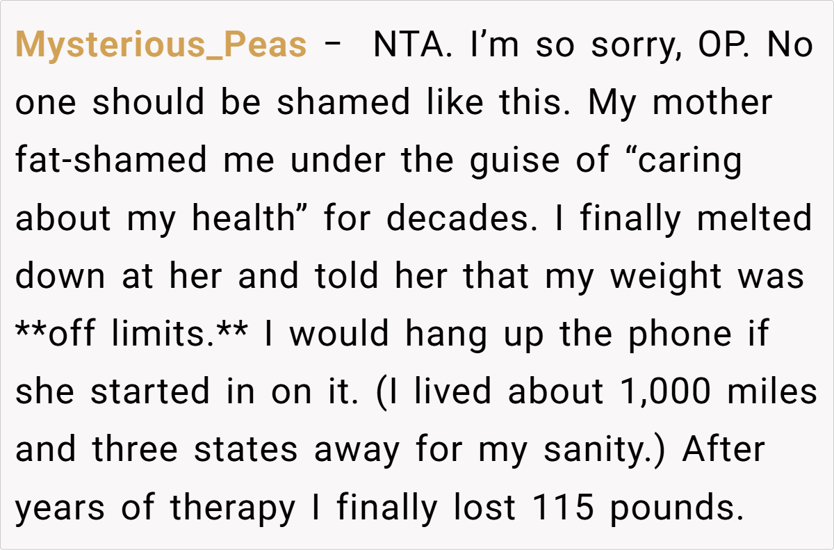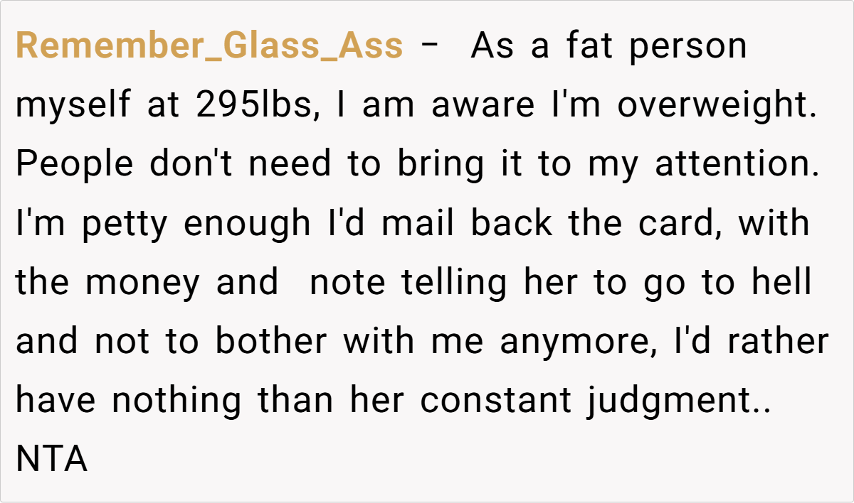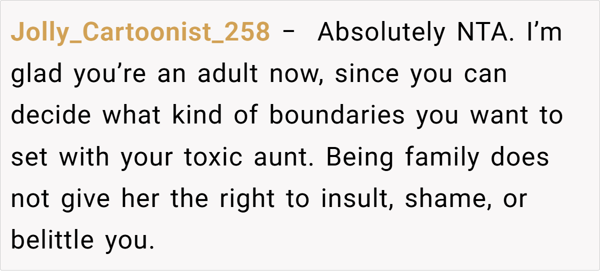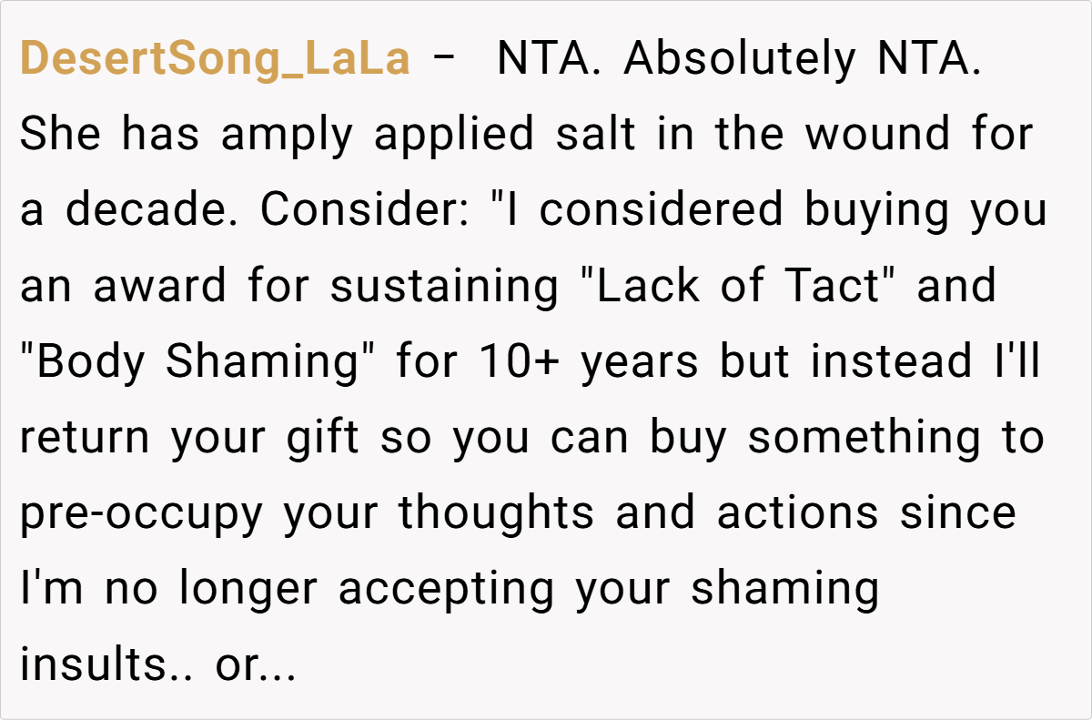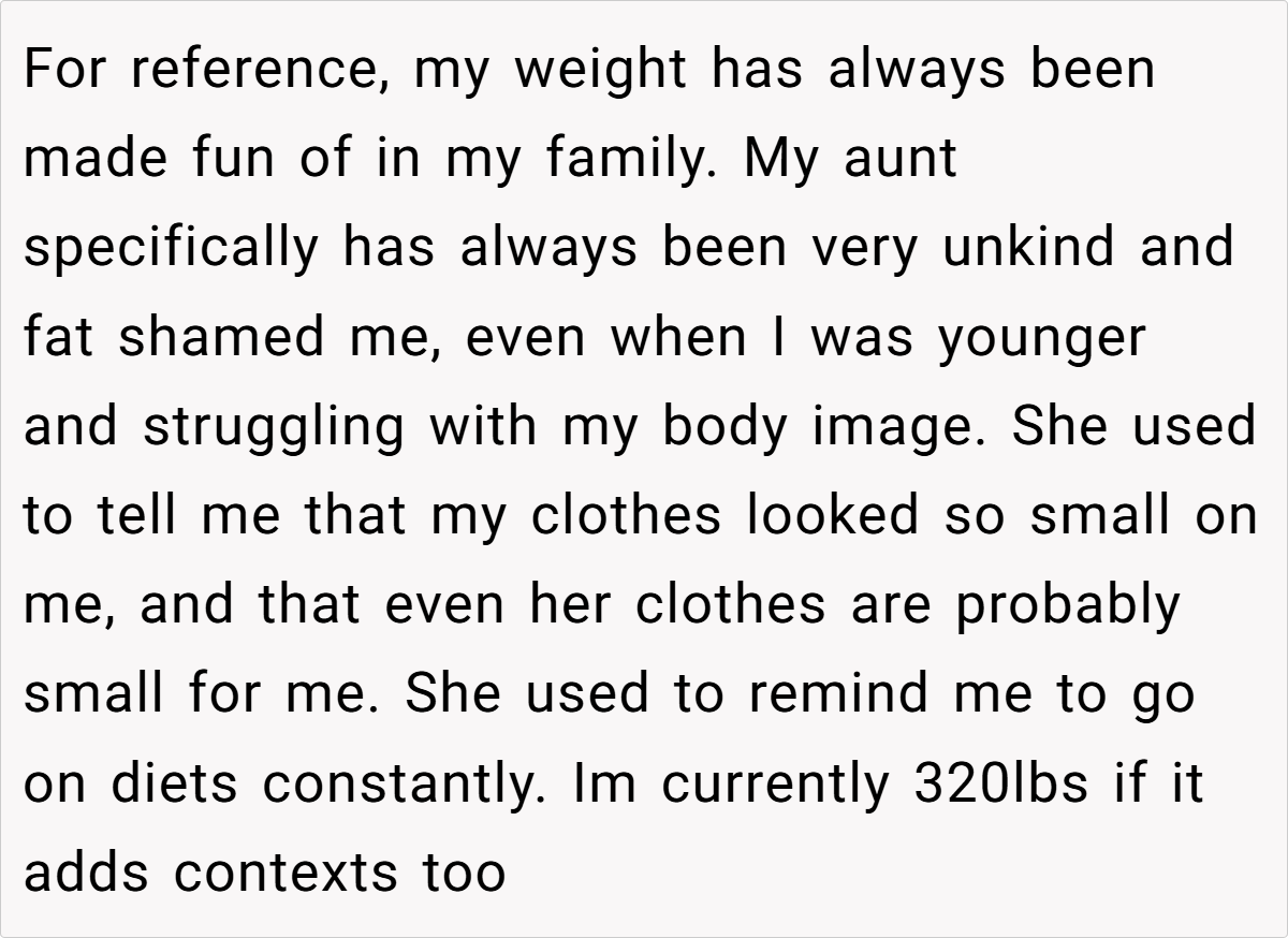 Across the board, commenters expressed strong support for the original poster. Many agreed that her reaction was completely justified after years of being fat-shamed by her aunt. The consensus was that such hurtful, unsolicited comments have no place in any family gathering, and setting boundaries is a vital step toward self-respect.