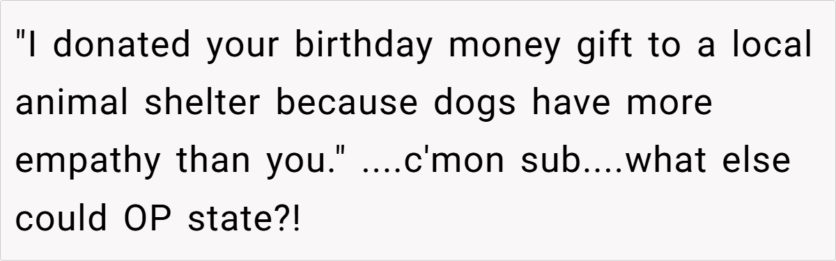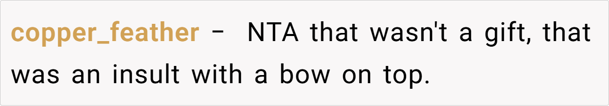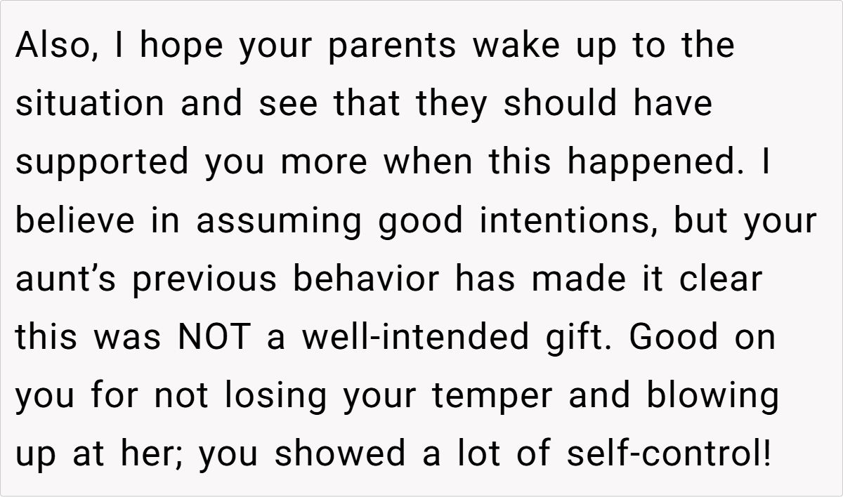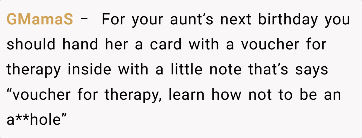 In a moment meant for celebration, the card and her aunt’s callous remarks left her feeling humiliated in front of her parents. Now, she’s left questioning if it’s fair to set boundaries against family members who use “concern” as a guise for cruelty. Is she overreacting, or is there a right to refuse such toxic behavior?