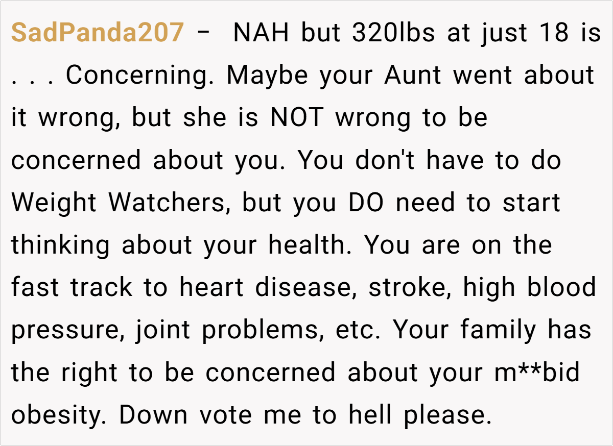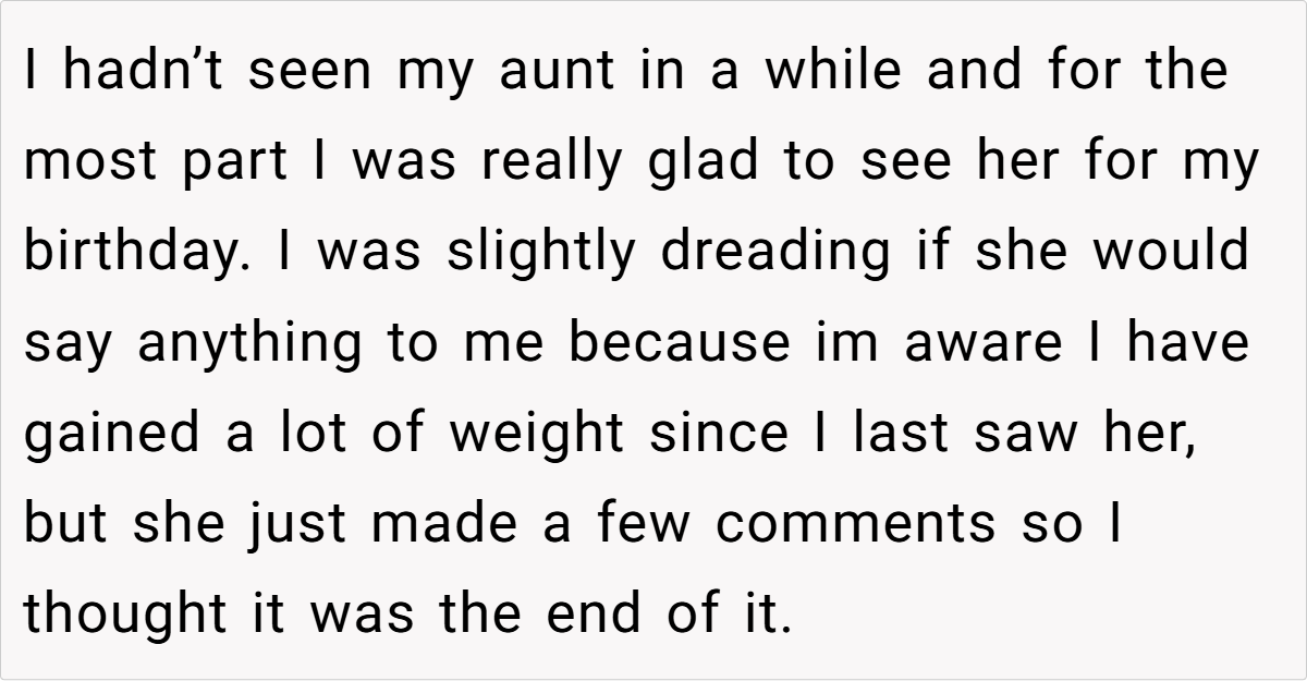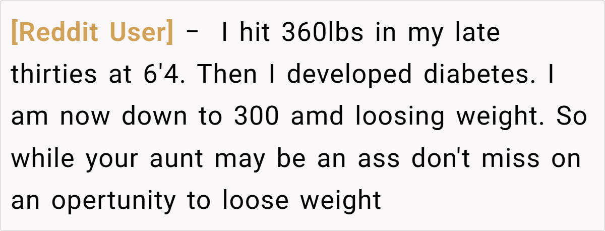 While a few voices suggested that the aunt’s comments might also hint at genuine health concerns, most emphasized that concern does not excuse public humiliation. In summary, the community largely stood with the poster, urging her to protect her well-being and maintain firm boundaries against ongoing body shaming.