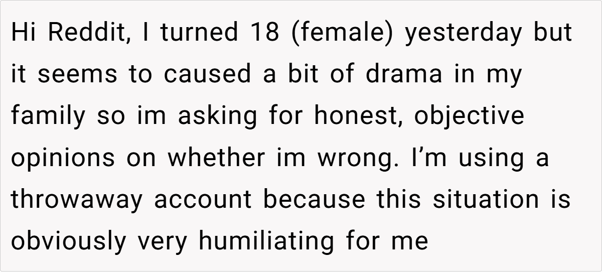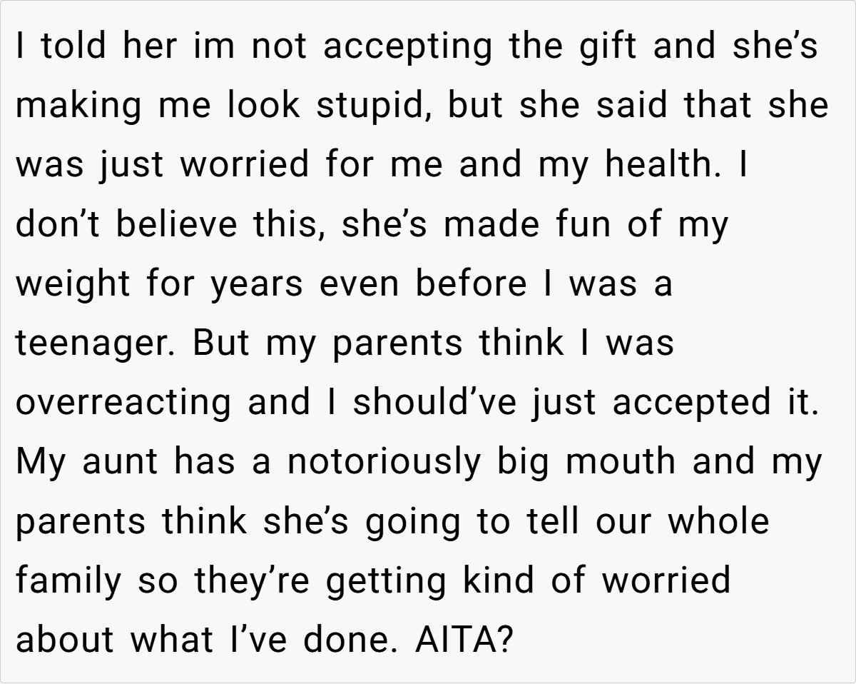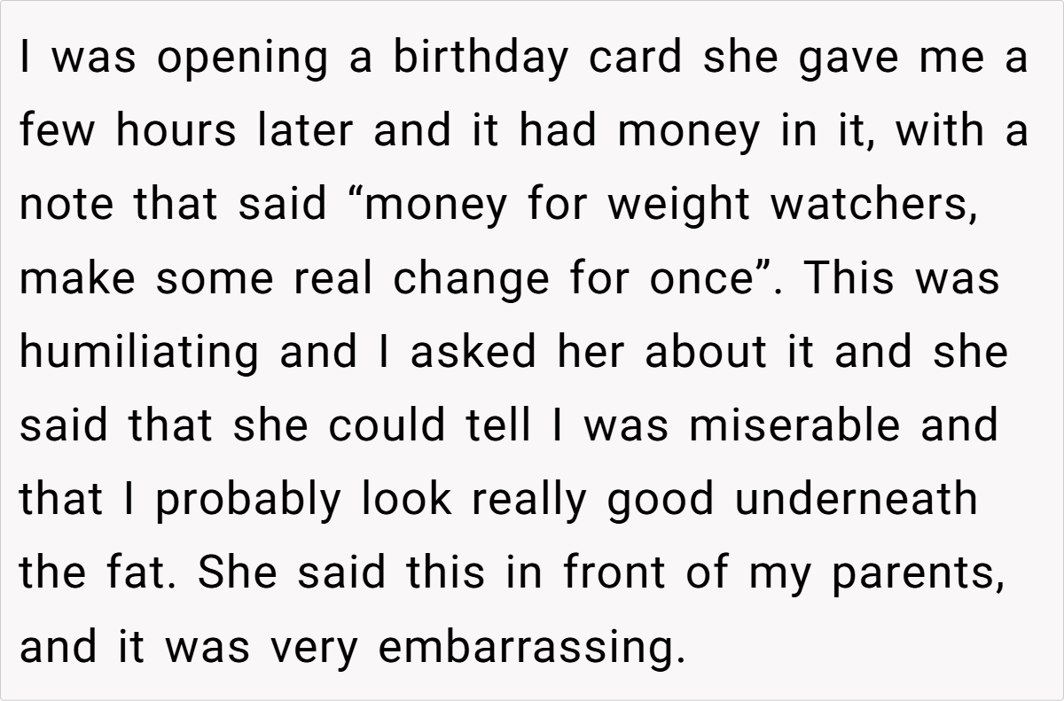 Turning 18 is a milestone that should be celebrated with pride and joy. However, for one redditor, her birthday became a source of deep embarrassment and family drama. Despite finally reaching adulthood, she found herself facing hurtful fat-shaming—a painful echo of years past when her weight was constantly the subject of ridicule. Instead of receiving a warm welcome, she was met with a birthday card that insultingly suggested she use the money for Weight Watchers, a stark reminder of a long history of unkind comments from her aunt.