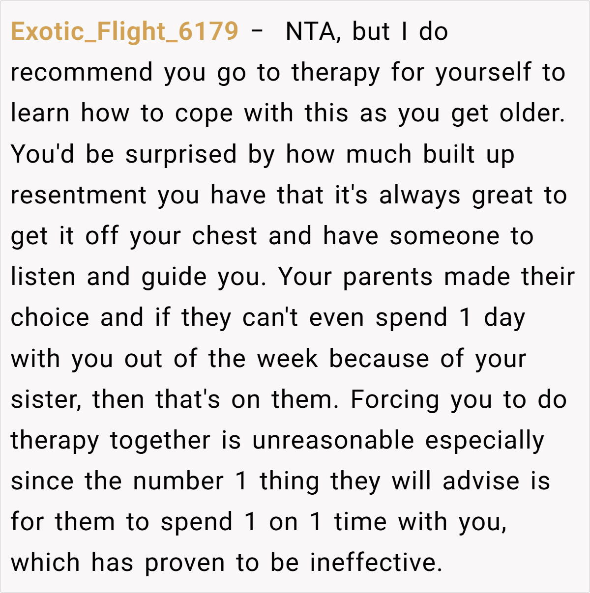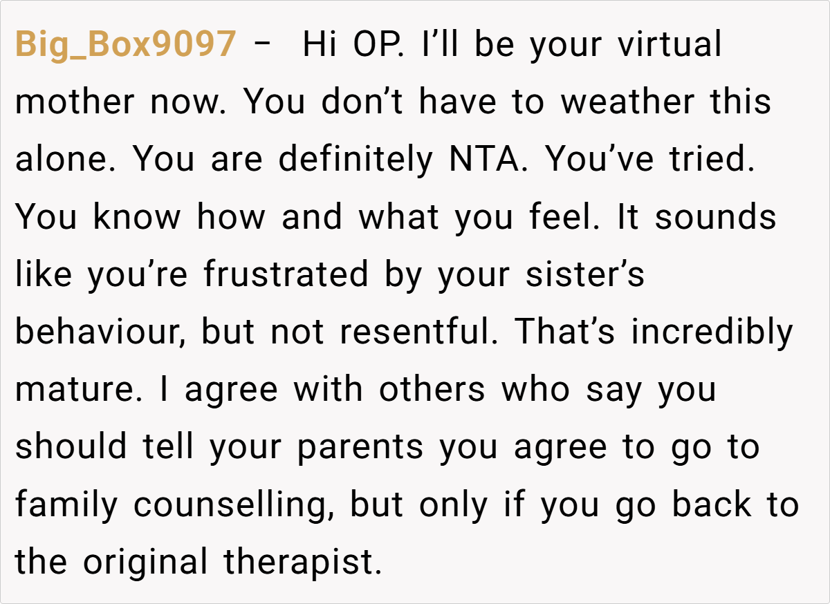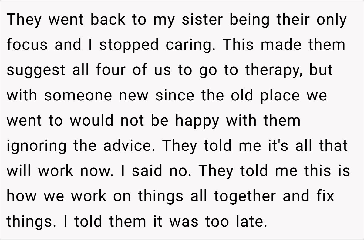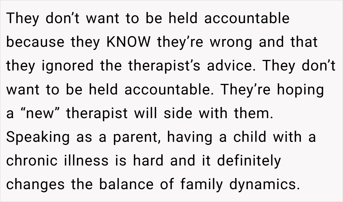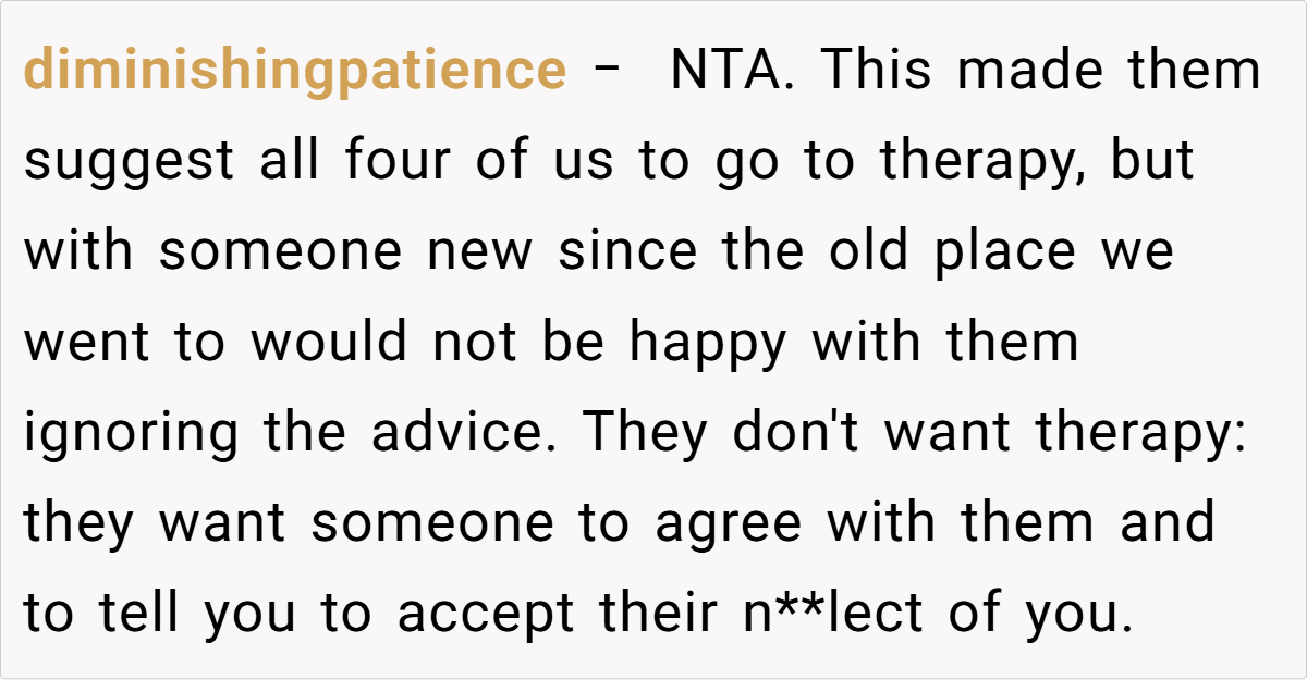 Moreover, experts agree that when parents continually prioritize one child’s needs at the expense of another, it creates an environment ripe for resentment. Dr. Carter adds, “Therapy should not feel like an imposition. It must come from a genuine desire to understand and change unhealthy patterns. Without that, it becomes another reminder of past failures.” In this light, the OP’s decision to refuse joint therapy is seen as an understandable, if painful, stand for self-respect.
