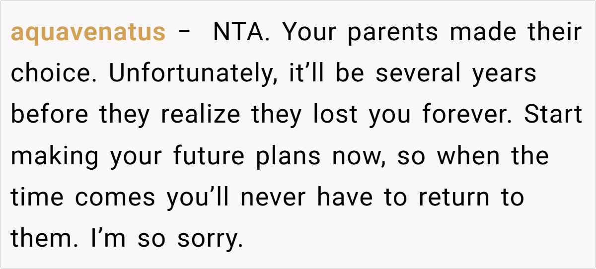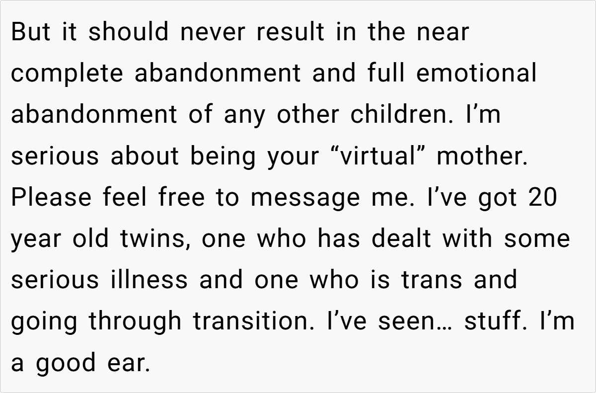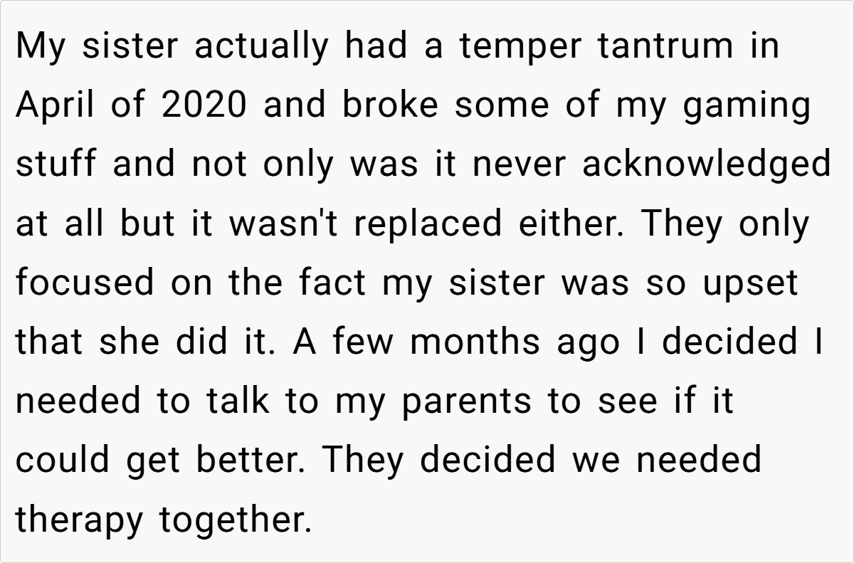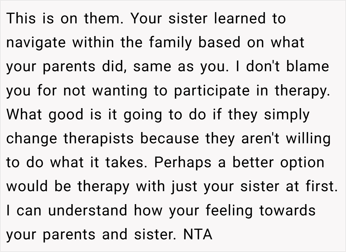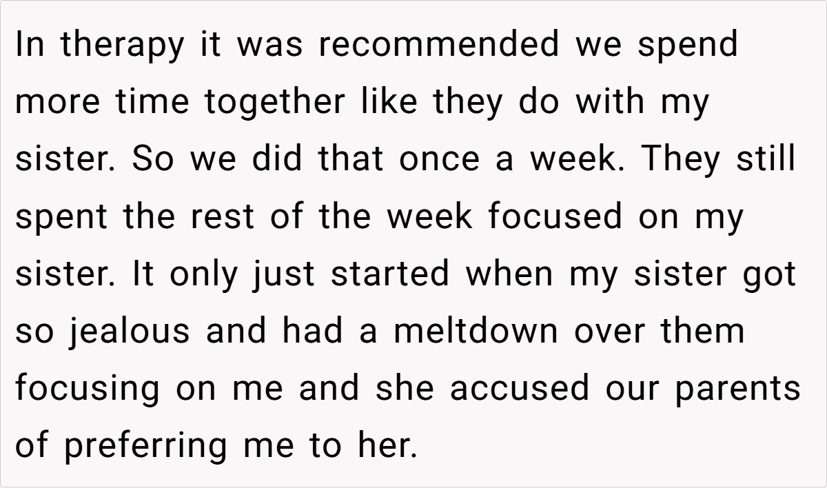 Moreover, experts agree that when parents continually prioritize one child’s needs at the expense of another, it creates an environment ripe for resentment. Dr. Carter adds, “Therapy should not feel like an imposition. It must come from a genuine desire to understand and change unhealthy patterns. Without that, it becomes another reminder of past failures.” In this light, the OP’s decision to refuse joint therapy is seen as an understandable, if painful, stand for self-respect.