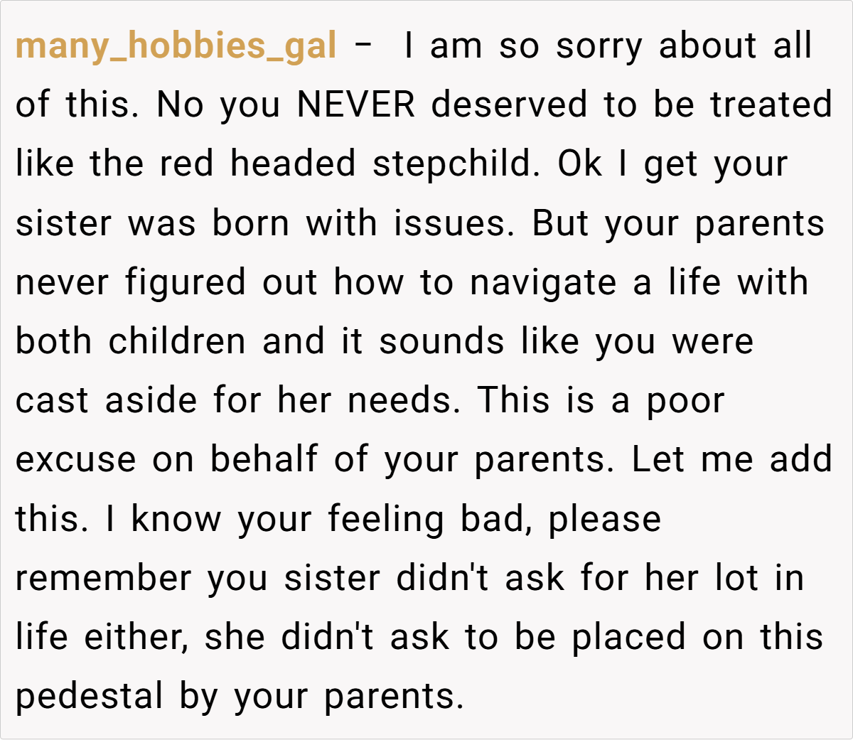 The Reddit community overwhelmingly supports the OP’s decision. Many commenters empathize with his longstanding feelings of neglect, arguing that he has every right to refuse participating in a process that forces him to accept a lifetime of being the “afterthought.” Several users have expressed sympathy for his situation, sharing similar experiences of feeling overshadowed by a sibling’s needs. The consensus is that while family therapy can be beneficial, it must be a mutual effort—and when one party feels consistently marginalized, forcing therapy can do more harm than good.