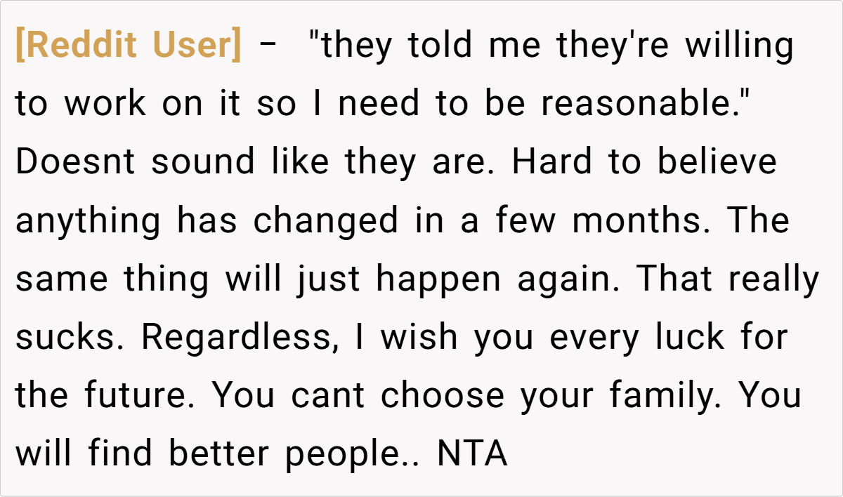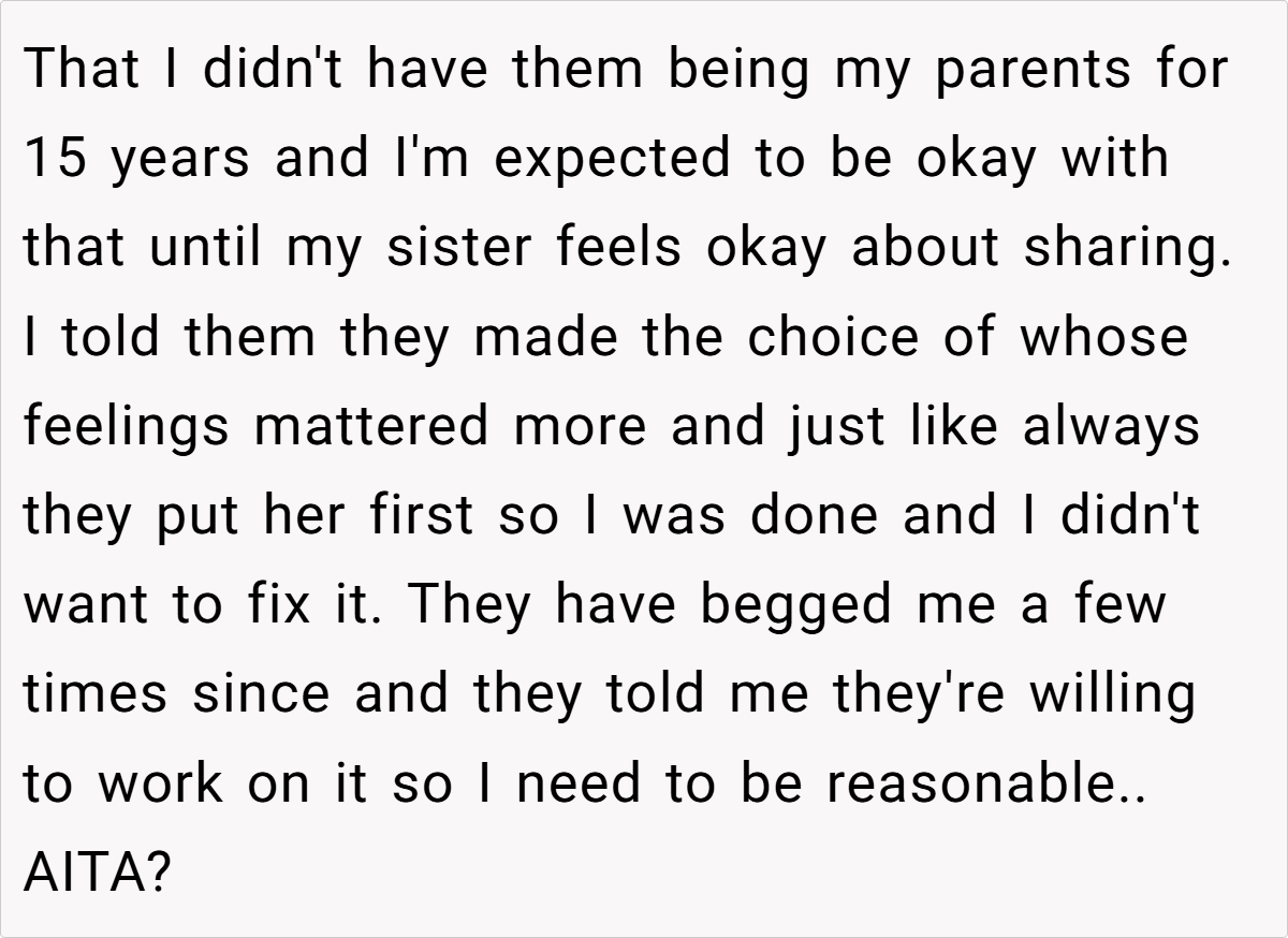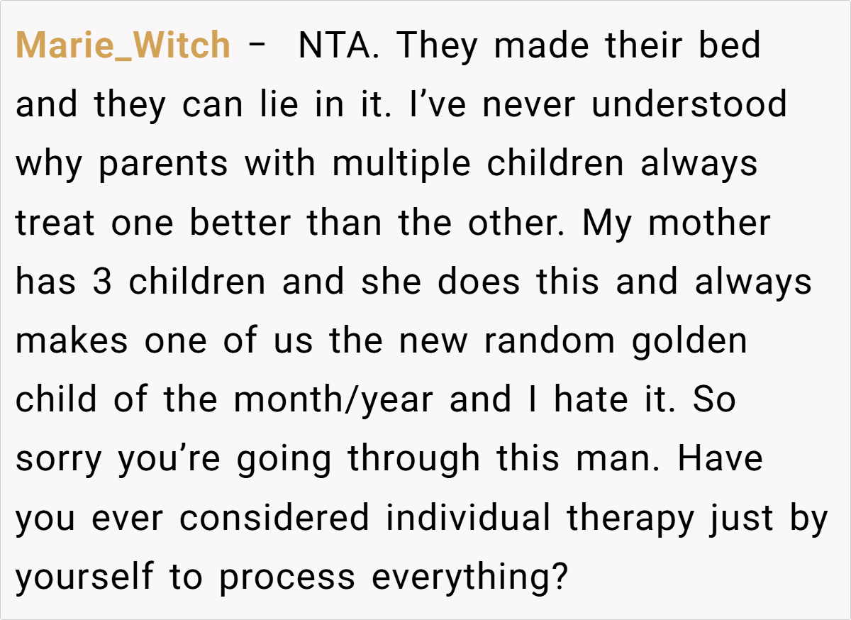 In conclusion, the OP’s refusal to join in family therapy is a powerful statement about self-worth and the need for genuine change rather than empty gestures. His story highlights the complex interplay between parental favoritism, emotional neglect, and the challenges of healing a fractured family dynamic. While therapy can be a path to reconciliation, it must come from a place of mutual commitment and understanding—not from a demand that one simply accept mistreatment.