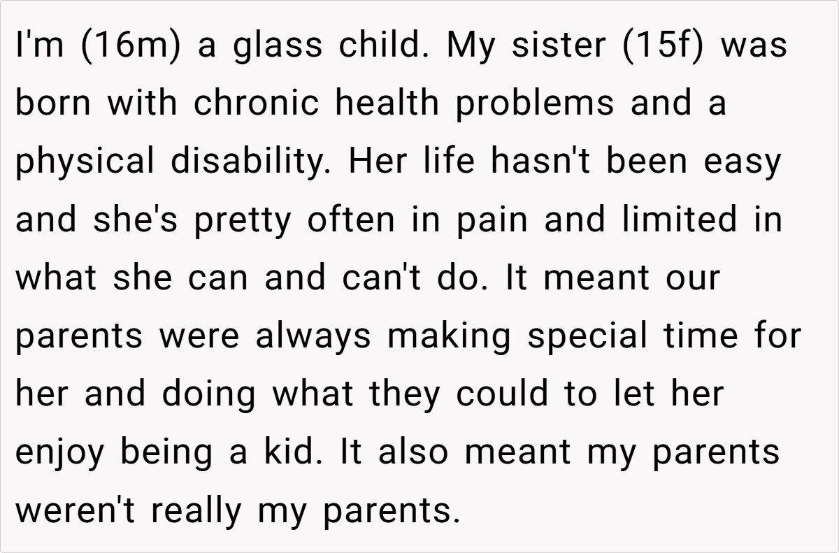 Family dynamics can be complicated enough on their own, but when feelings of neglect and resentment have built up over years, even a well-intentioned suggestion like therapy can feel like a betrayal. In this story, a 16-year-old boy—feeling like the perpetual “glass child”—shares his painful experience of being sidelined by his parents in favor of his chronically ill sister. For years, he watched as every celebration and special moment was reserved for her, leaving him feeling abandoned and unimportant. When his parents tried to remedy the situation through family therapy, it only reignited old wounds.