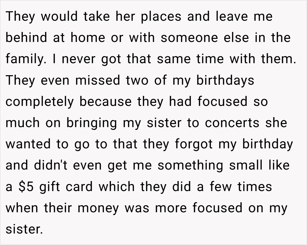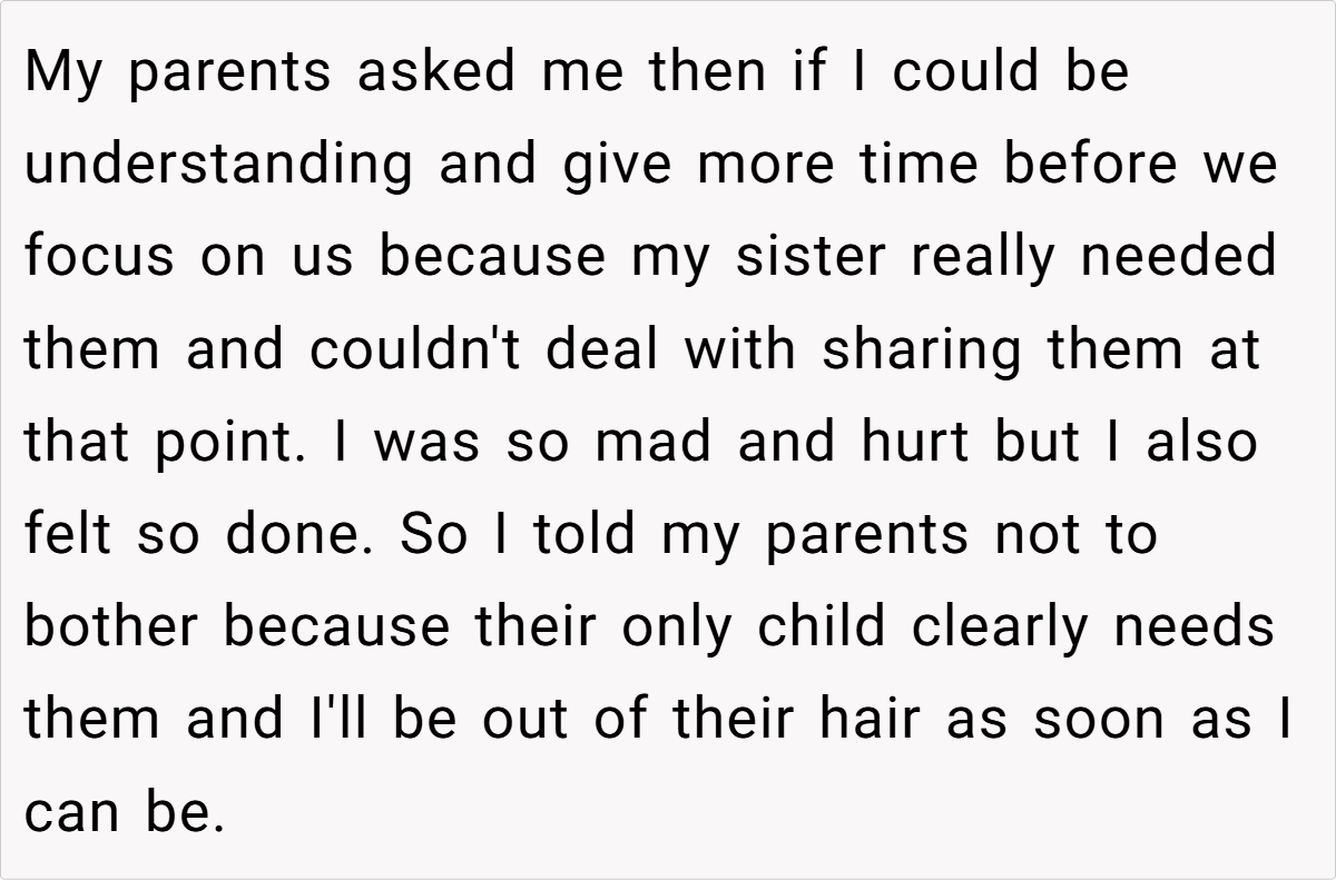 Instead of healing old hurts, the therapy sessions underscored how deeply his parents’ focus on his sister had marginalized him. Faced with another attempt to force the family into a session together, he reached his breaking point. With a heavy heart, he decided to refuse the therapy, choosing to distance himself rather than keep enduring the emotional neglect he’s experienced all his life.