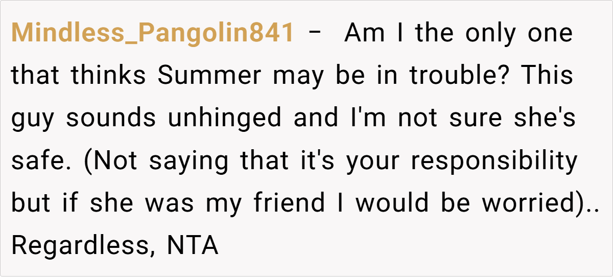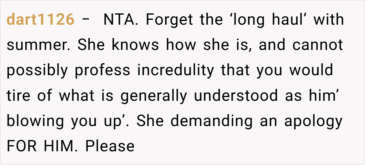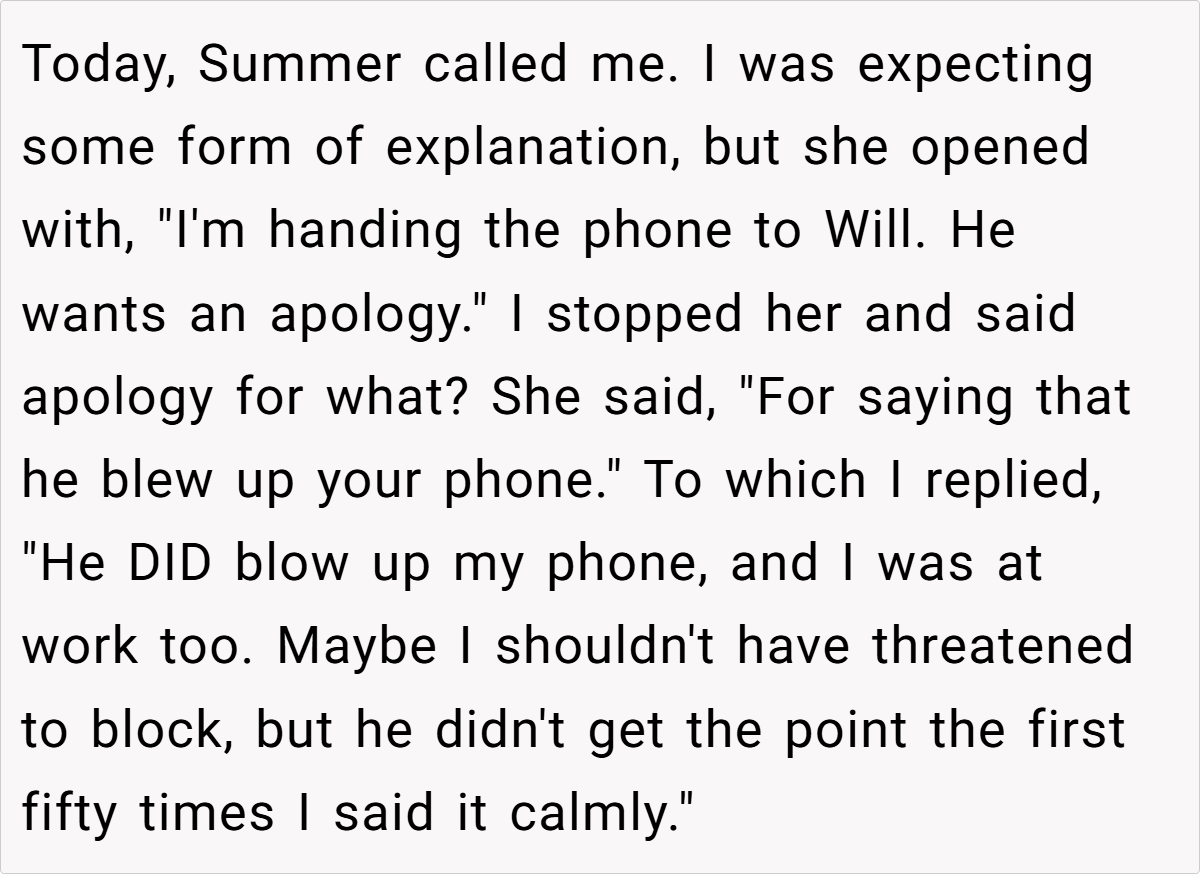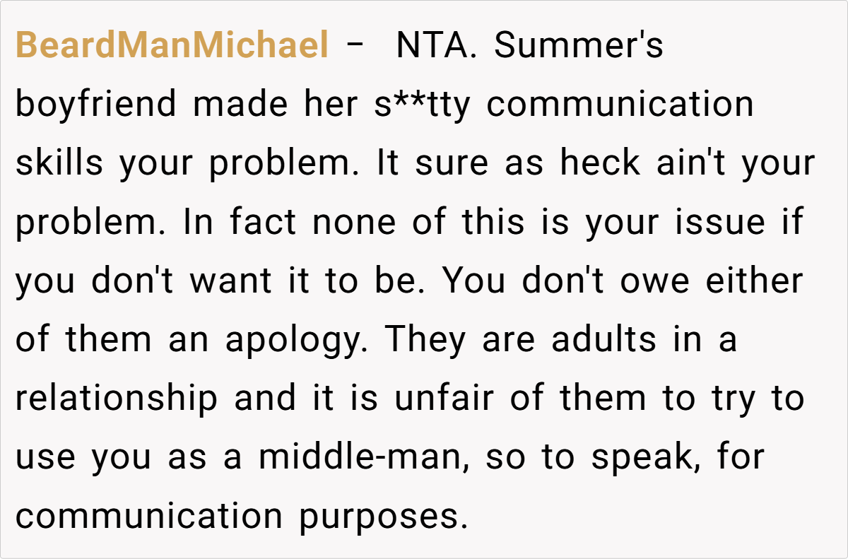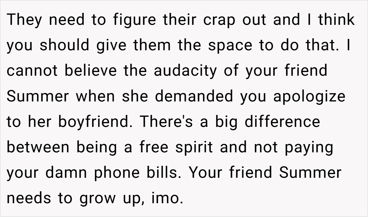 The Reddit community has been unreservedly candid about this conflict. A majority of commenters agree that our OP’s reaction was justified and that the incessant phone calls from Summer’s boyfriend crossed a line. Many pointed out that his aggressive behavior—repeatedly demanding information he already knew about—was unreasonable, and that it’s not fair to make someone apologize for simply stating the truth. The consensus is clear: in this scenario, standing firm on personal boundaries is the right call.