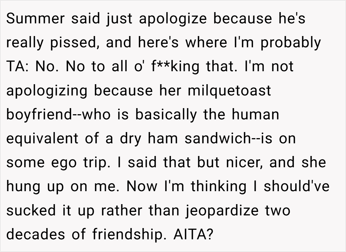 ‘AITA for refusing to apologize to my friend’s boyfriend?’