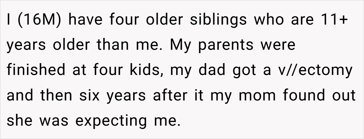 Some families shower their youngest child with love and affection. Others? Not so much. In a twisted version of sibling rivalry and parental resentment, OP (16M) grew up knowing he was never truly wanted. Labeled the “mistake” child, excluded from family events, and treated as free childcare, he finally hit his breaking point.