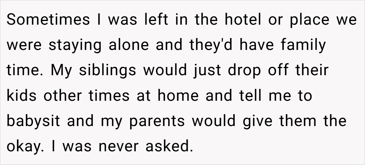 What’s worse is that OP wasn’t just ignored—he was forced into a role that wasn’t his to play. The act of making a child take on adult responsibilities, particularly caregiving for younger siblings, is known as parentification.