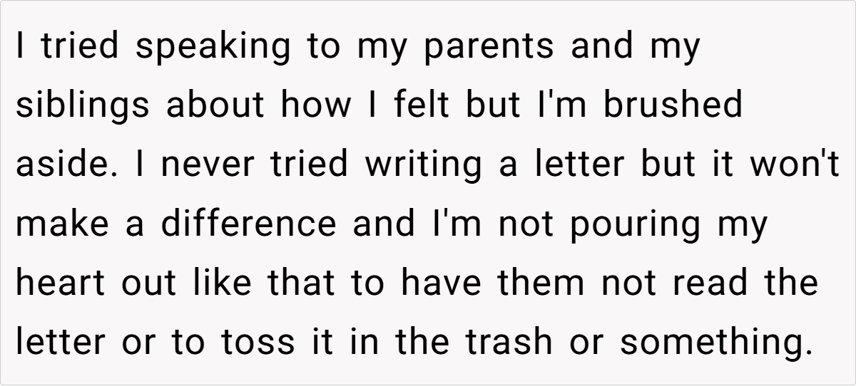 - Neglect Leaves Scars – OP’s family may have treated him as an afterthought, but that treatment has consequences. Emotional neglect isn’t just painful in the moment—it shapes a person’s entire view of self-worth and belonging.