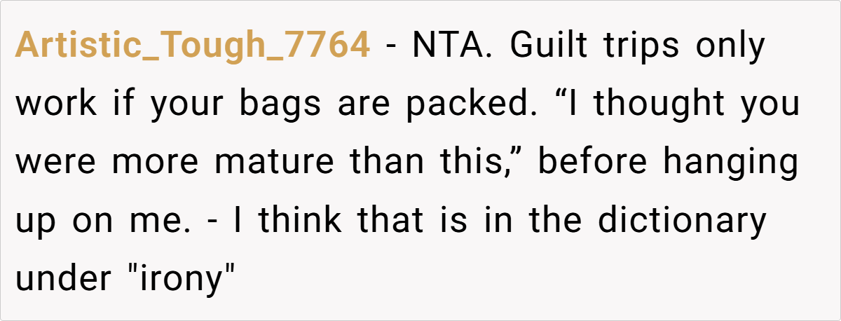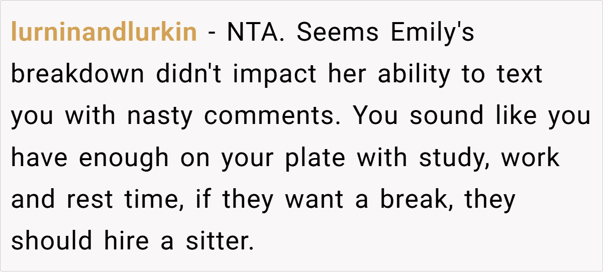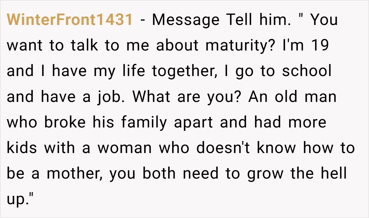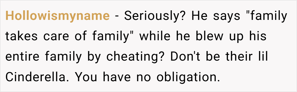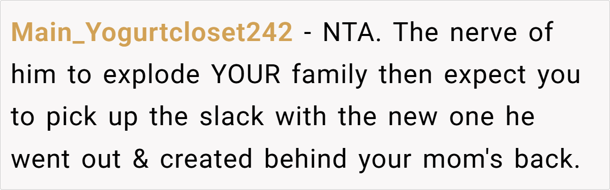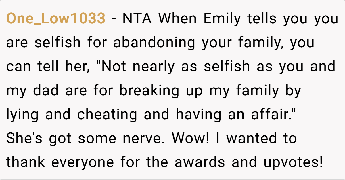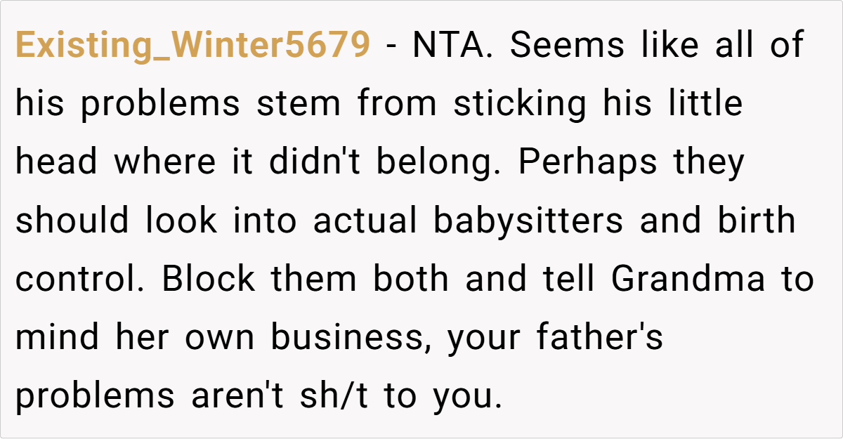 Reddit overwhelmingly agrees: OP is not the bad guy here. Many highlight the hypocrisy of a father who destroyed a family now demanding unconditional support. Others suggest that OP’s father and stepmother should seek professional childcare instead of emotionally manipulating her.