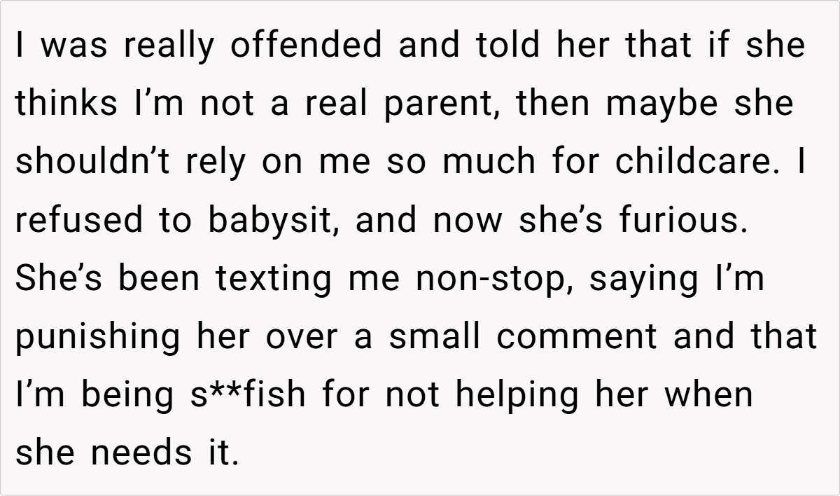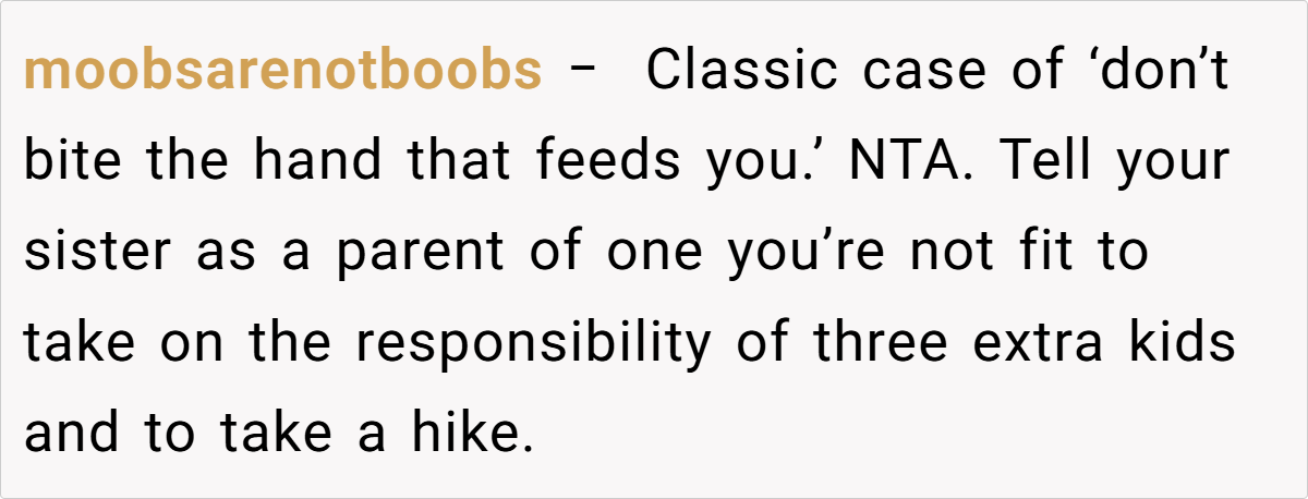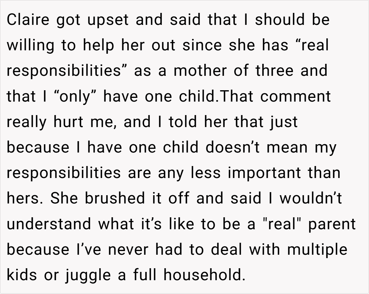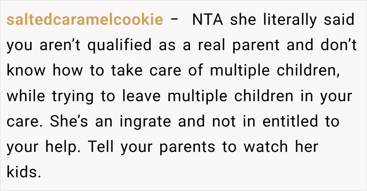 Reddit users didn’t hold back their thoughts on the matter, and the majority were firmly on OP’s side. Here are some highlights: “She literally said you aren’t qualified as a real parent and don’t know how to take care of multiple children, while trying to leave multiple children in your care. She’s an ingrate.”