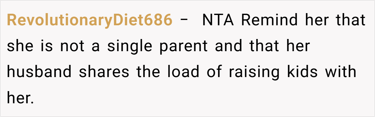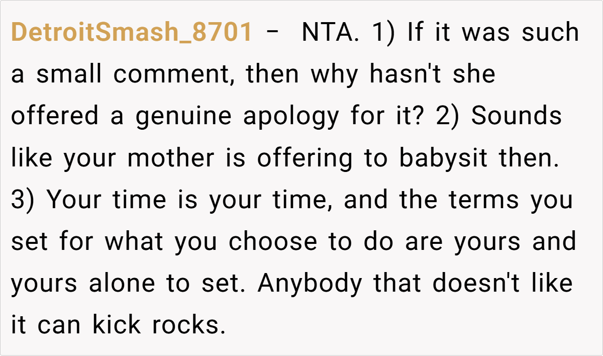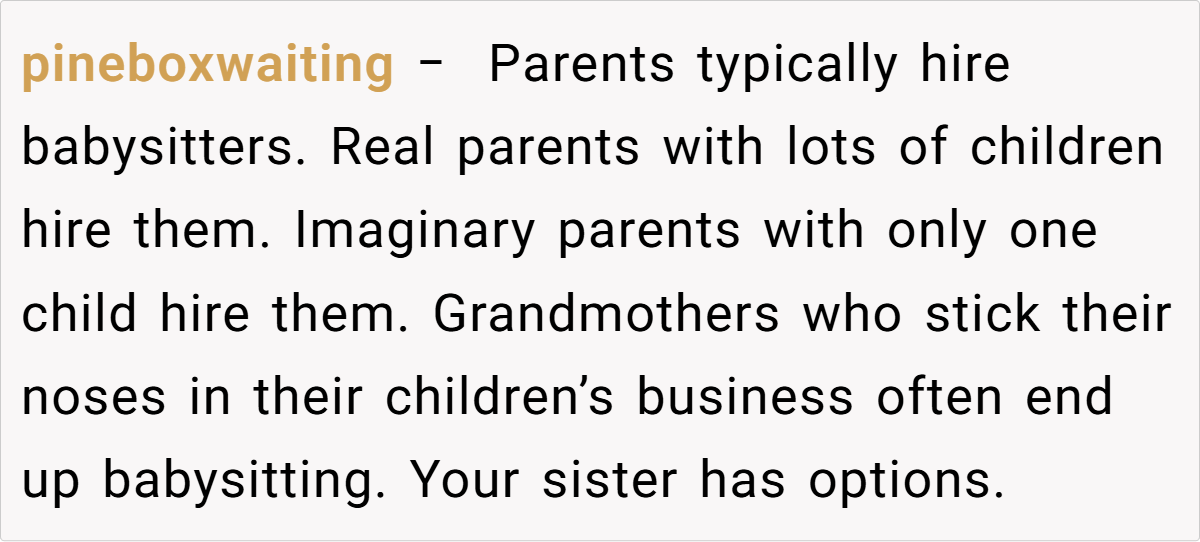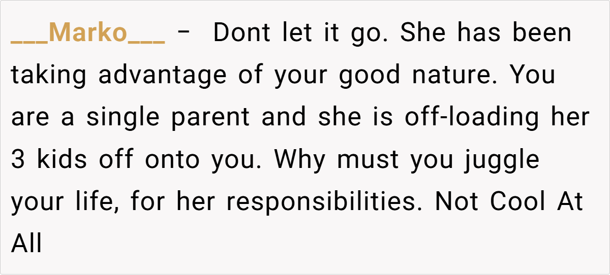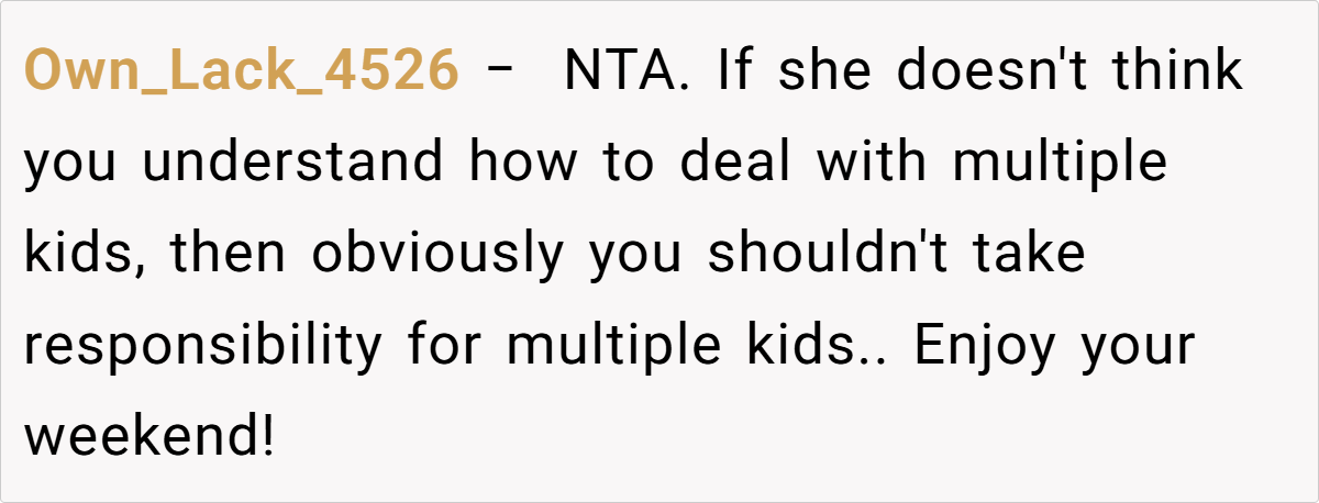 Reddit users didn’t hold back their thoughts on the matter, and the majority were firmly on OP’s side. Here are some highlights: “She literally said you aren’t qualified as a real parent and don’t know how to take care of multiple children, while trying to leave multiple children in your care. She’s an ingrate.”