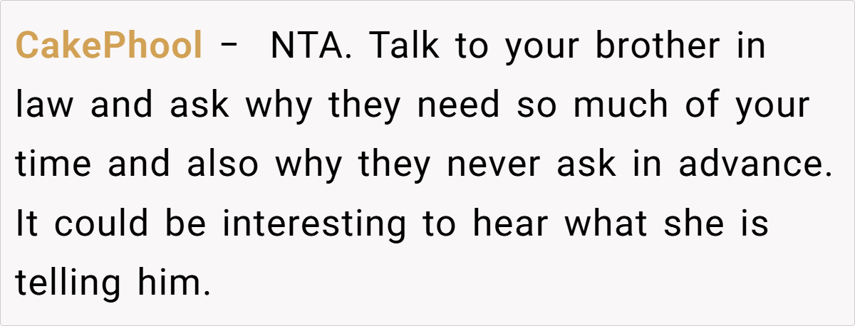 But the issue isn’t just about words—it’s also about the lack of respect for the OP’s time and autonomy. While helping family is important, it’s equally vital to ensure that one’s own responsibilities and well-being aren’t sacrificed in the process. Claire’s frequent last-minute requests suggest a pattern of over-reliance, leaving OP to juggle his life around her needs.