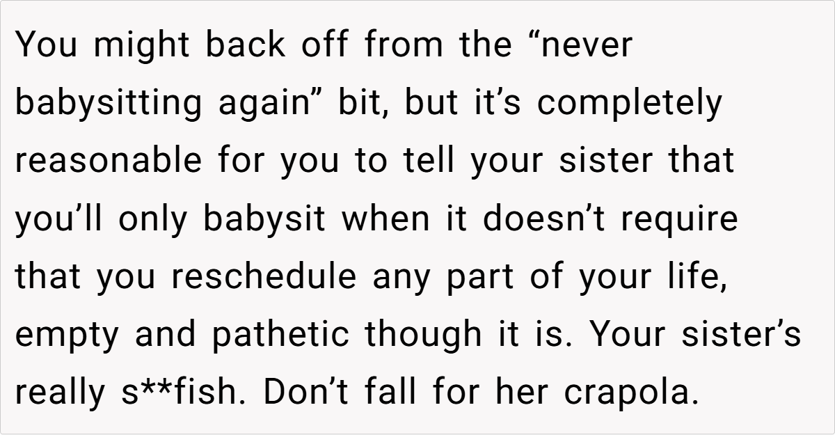Dr. Lieberman emphasizes that OP’s decision to refuse babysitting after being disrespected is not selfish—it’s self-preservation. “It’s crucial to stand up for yourself when others take your kindness for granted. If you continue to allow people to cross your boundaries, it sends a message that your needs and feelings don’t matter.”