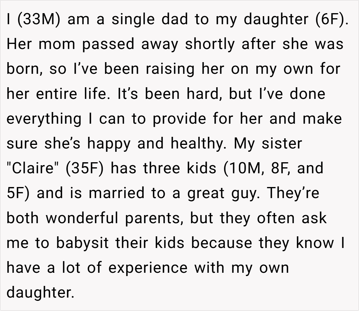 Being a single parent is no easy task, and one Redditor (33M) knows this all too well. After tragically losing his wife, he’s been raising his 6-year-old daughter on his own, ensuring she grows up happy and healthy. Despite his busy schedule, he often steps up to help his sister, Claire, and her three children by babysitting whenever she asks.