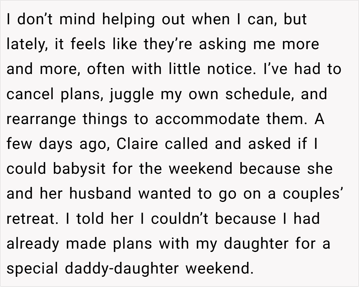 But when a recent request for last-minute childcare clashed with his special plans for a daddy-daughter weekend, the situation took an unexpected turn. Claire’s dismissive comments about his role as a parent led to a family feud, and now he’s left wondering if he was wrong to stand his ground. Read on to find out more about this compelling story.