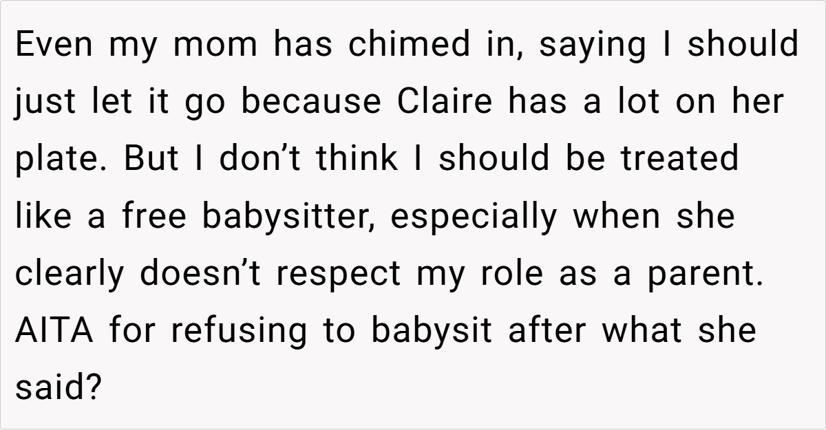 Some comments also pointed out the irony in Claire’s reliance on OP for childcare while simultaneously belittling his parenting: “Don’t bite the hand that feeds you. Tell her to hire a babysitter if your one-child life isn’t ‘real’ enough for her.” “Your mom says Claire has a lot on her plate? What about you, a single dad doing everything on your own?” Clearly, the community feels that OP is justified in standing up for himself.