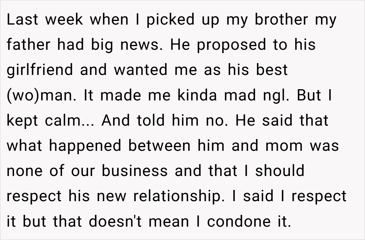 Family dynamics can sometimes feel like walking through a minefield of old wounds and unresolved emotions. In this story, a daughter grapples with the fallout of a long-ago betrayal while facing a fresh family dilemma: being asked to play a key role in her father’s wedding. The scars of her past, combined with the pain of her family’s breakup, make it hard to look past the hurt, even when a new chapter is being written.