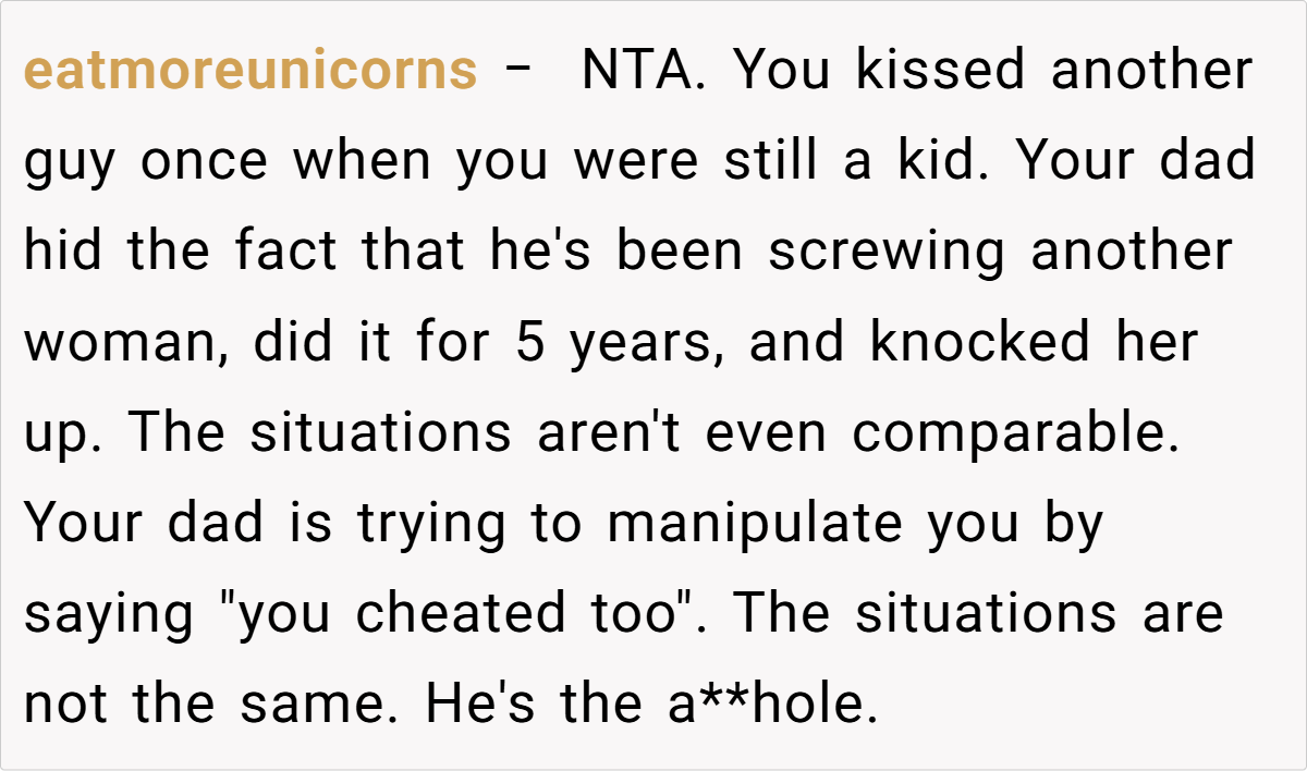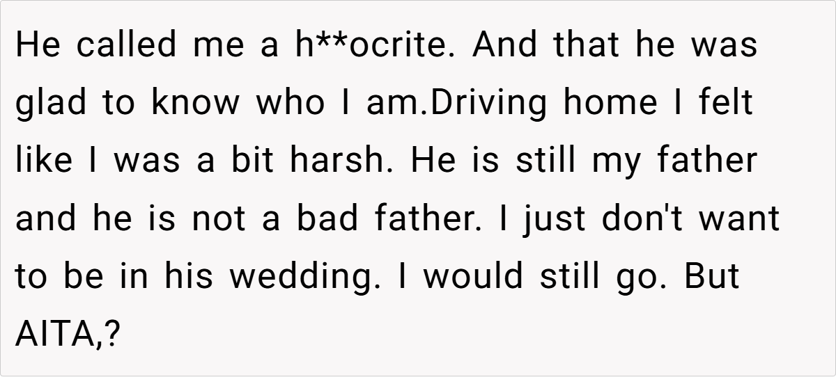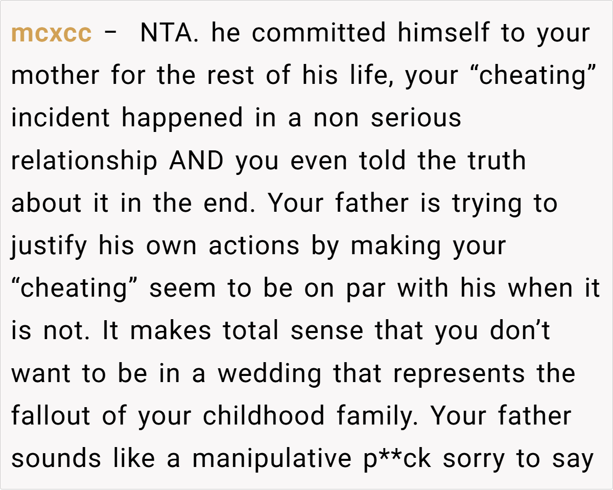 ‘ AITA for refusing to be in my father’s wedding even tho I “cheated too”?’