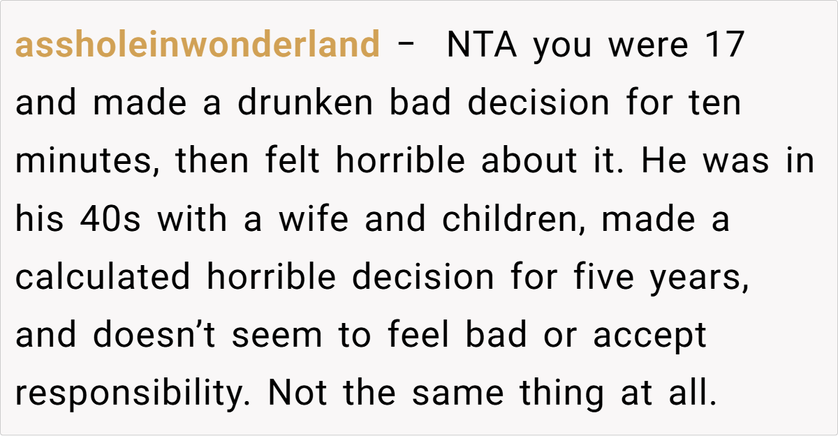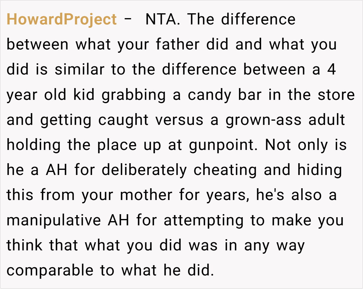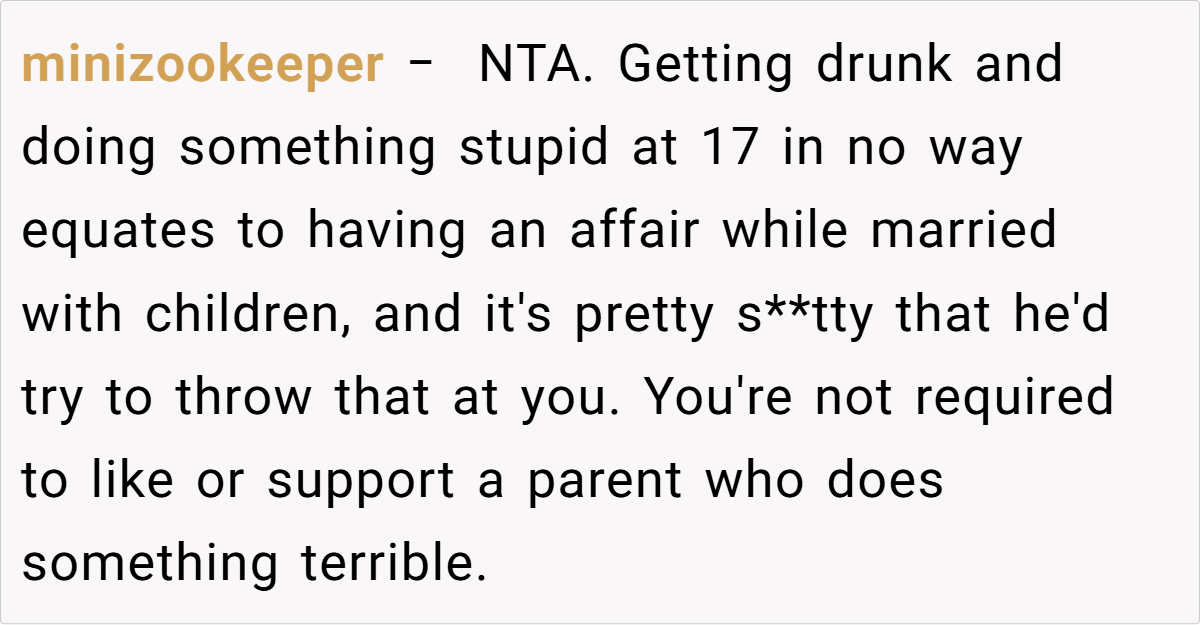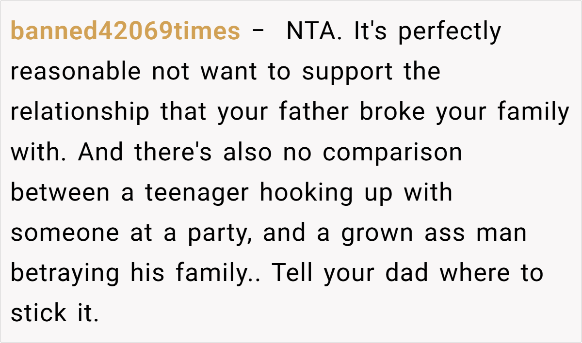 The Reddit community has been vocal, with many users firmly siding with the daughter. Comments underscore that a brief youthful mistake hardly compares to a prolonged period of betrayal that upended an entire family. The consensus is clear: holding a parent accountable for their actions is not only valid but necessary for personal healing.