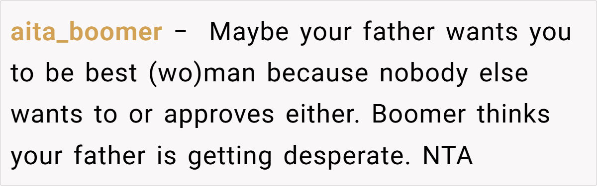 Family conflicts and the echoes of past betrayals often leave lasting emotional imprints. In this case, the daughter’s refusal to participate in her father’s wedding is a raw expression of deep-seated hurt. When a parent’s betrayal is compounded by manipulative comparisons, it forces us to confront the complex nature of forgiveness. The daughter’s past mistake, made as a teenager in a moment of vulnerability, is not equivalent to a calculated, long-term betrayal that shattered her family’s foundation.