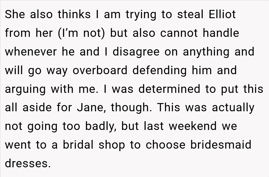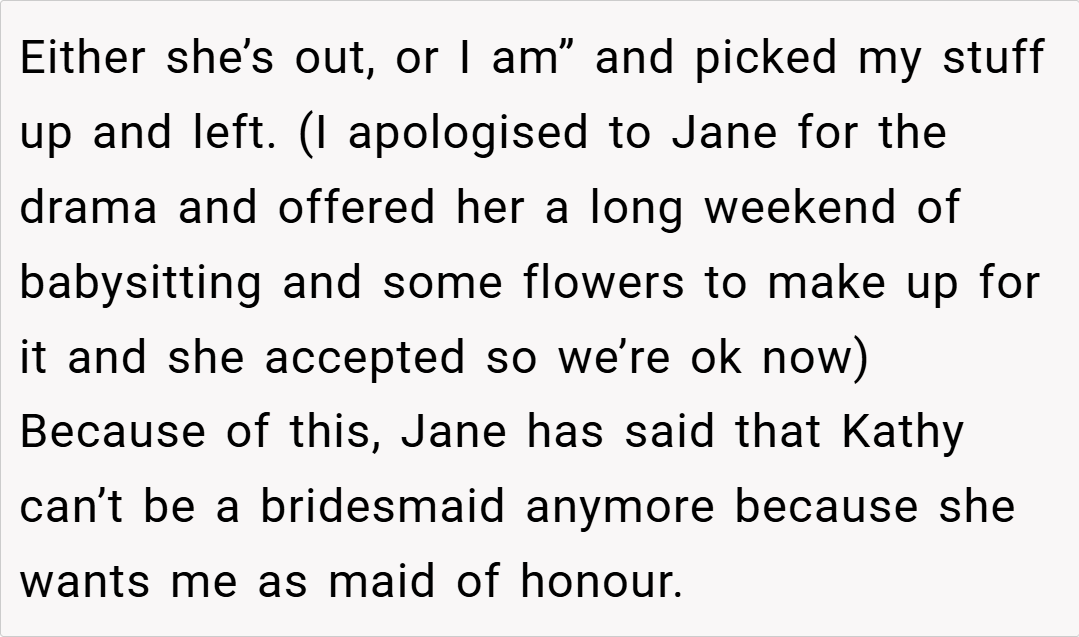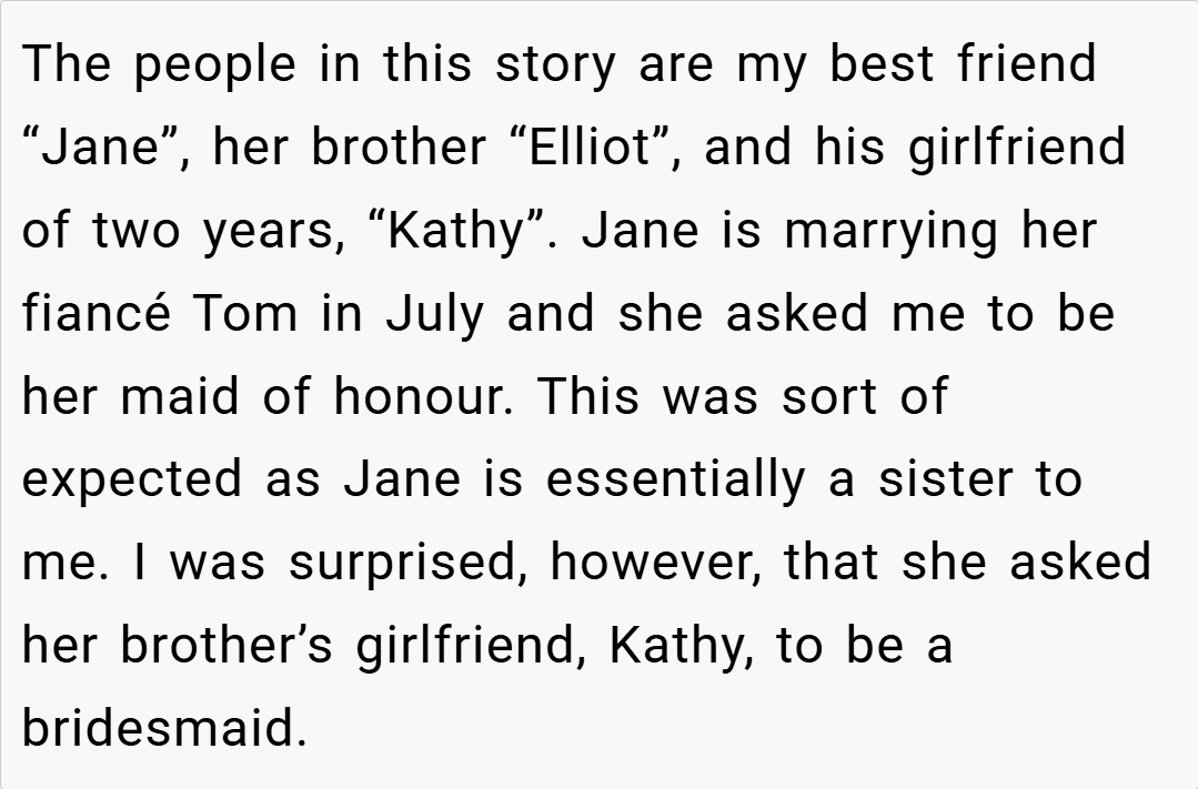 Weddings can bring out both the best and the most challenging sides of relationships. When my best friend Jane asked me to be her maid of honour, I was thrilled—she’s like a sister to me. However, things took a wild turn when Jane, under pressure from her brother Elliot and his girlfriend Kathy, included Kathy as a bridesmaid. Kathy has a long history of hostility toward me, and when we visited a bridal shop, her outburst left me with no choice but to draw a hard line. I told her, “Either she’s out, or I am,” and I left the scene.