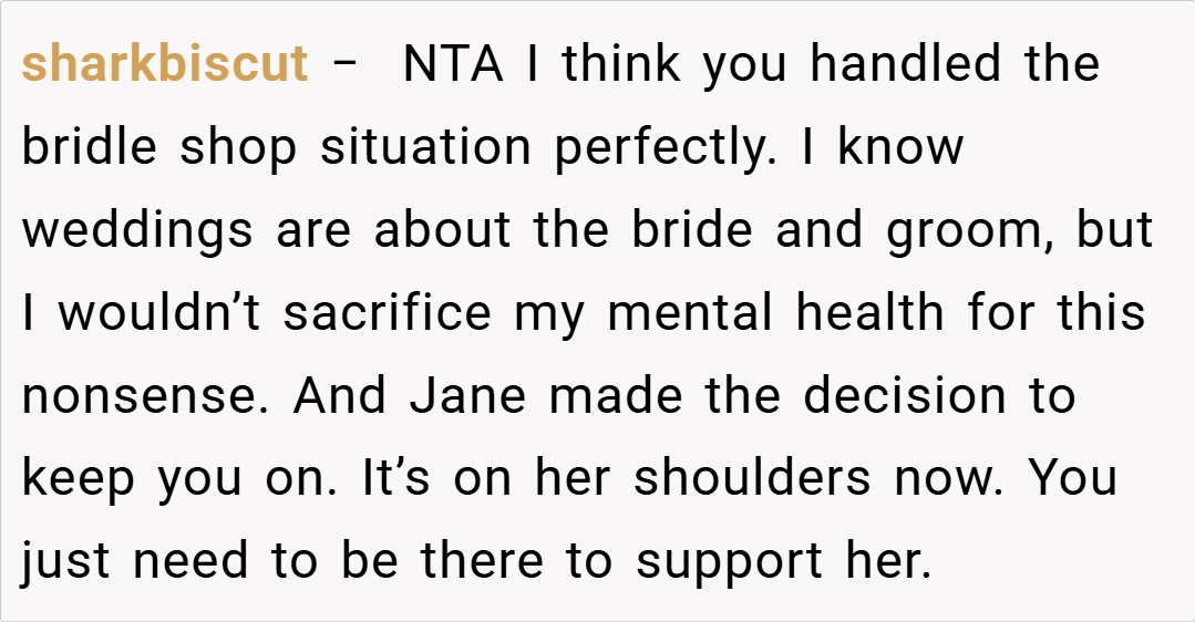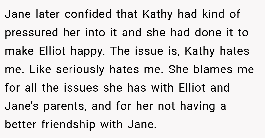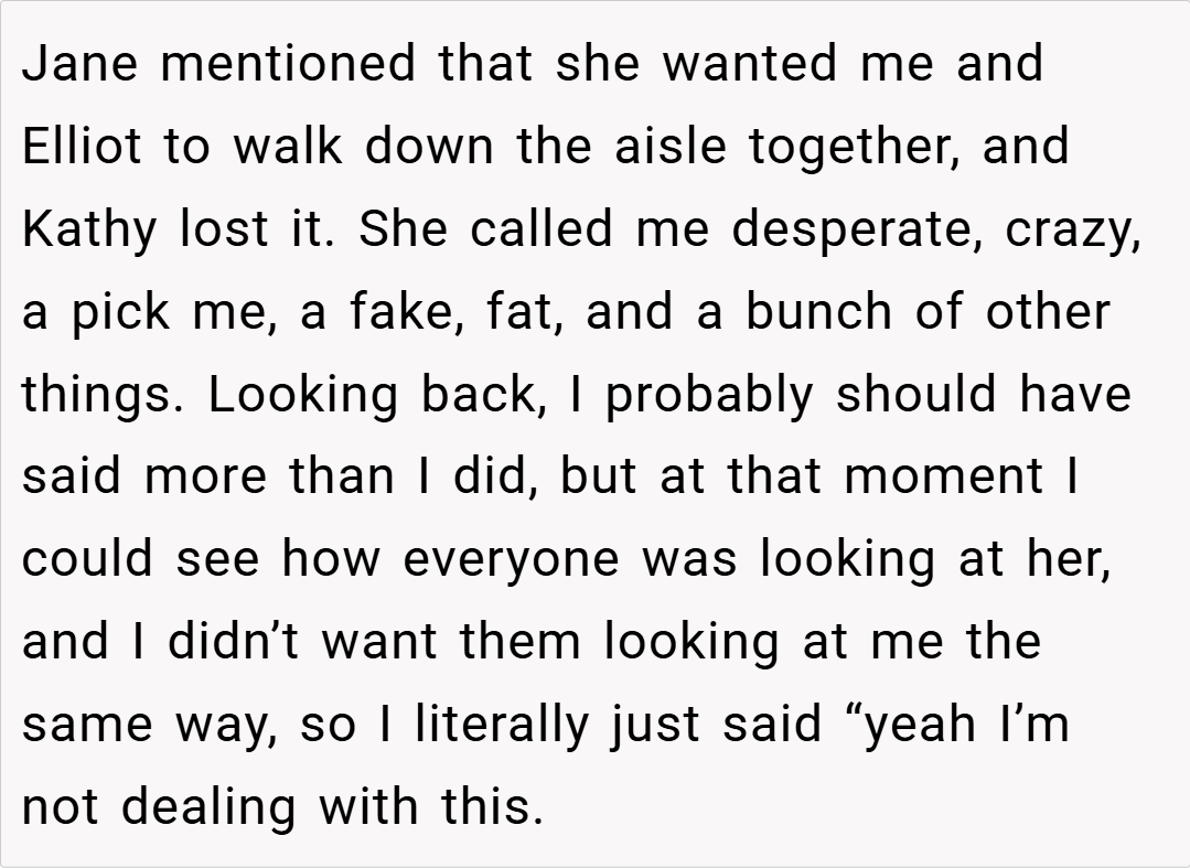 Furthermore, insisting on these boundaries during wedding preparations is not an act of selfishness but rather a demonstration of self-respect. While Jane may have initially believed that including Kathy was the best way to keep everyone happy, it became clear that such choices were leading to repeated conflict and discomfort.