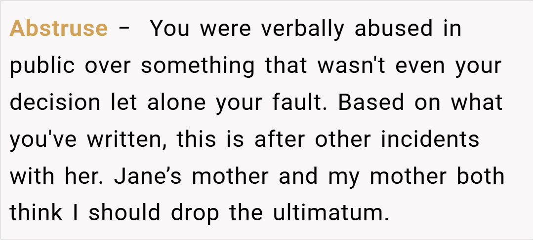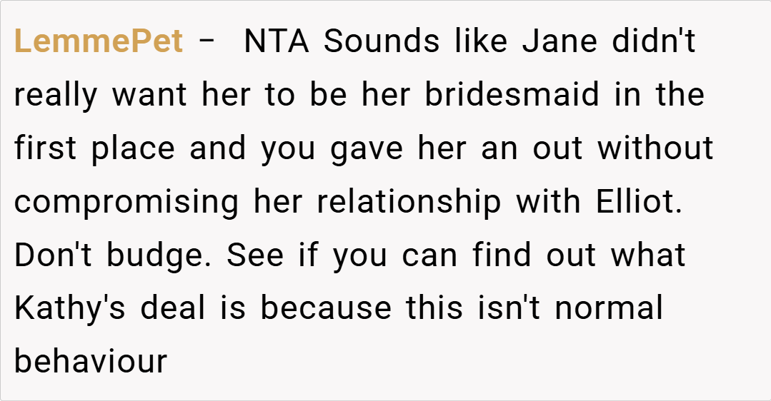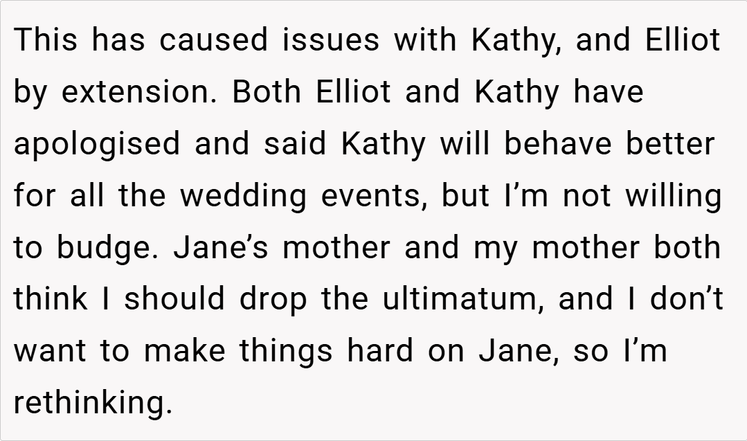 That moment ignited a series of events that forced Jane to make a difficult decision: she eventually removed Kathy from the wedding party. While both Elliot and Kathy have since apologised and promised to behave, I remain firm. My mom and Jane’s mom suggest I drop the ultimatum, but I worry that letting it slide will only lead to more drama down the line. Is standing up for myself worth the fallout, or have I caused too much disruption on what should be a joyous occasion?