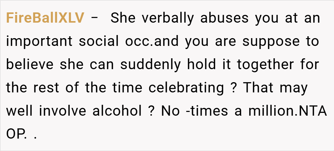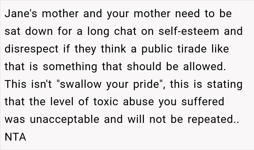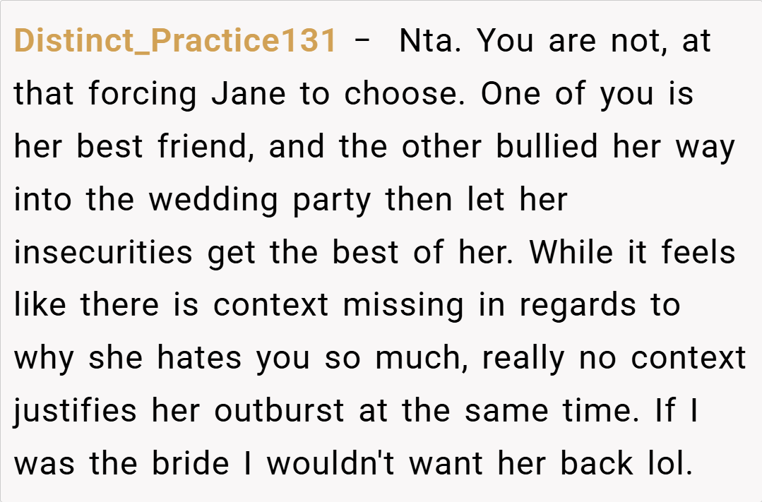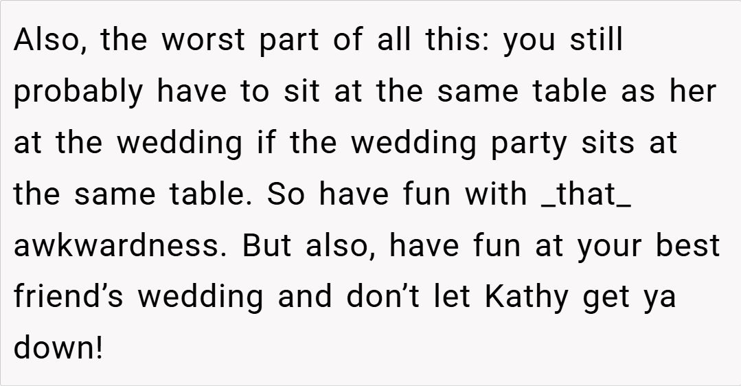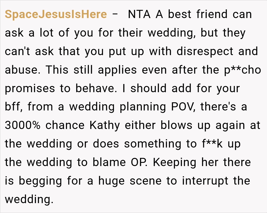 Here are some hot takes from the Reddit community—candid, honest, and refreshingly straightforward. Many users applauded my firm response to Kathy’s unacceptable behavior, noting that no one should be forced to endure public insults. They agreed that if a best friend’s wedding party becomes a battleground for toxic dynamics, it’s completely fair to draw the line and demand respect.