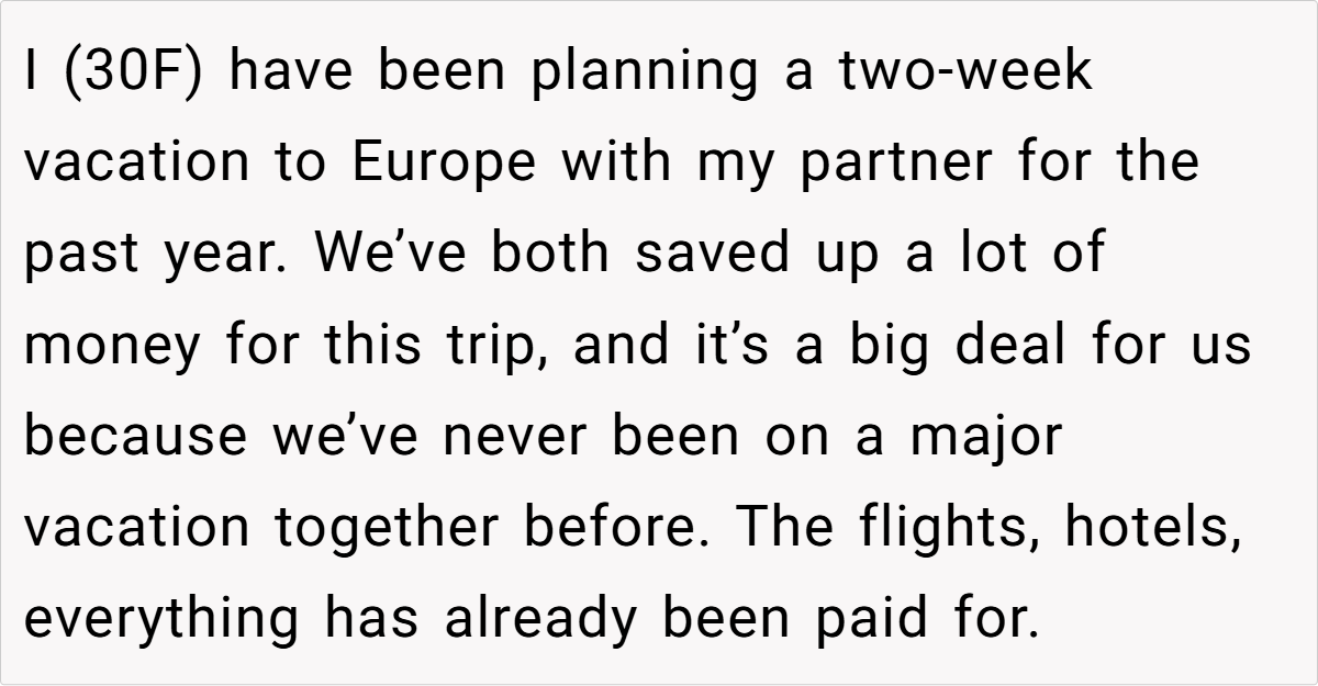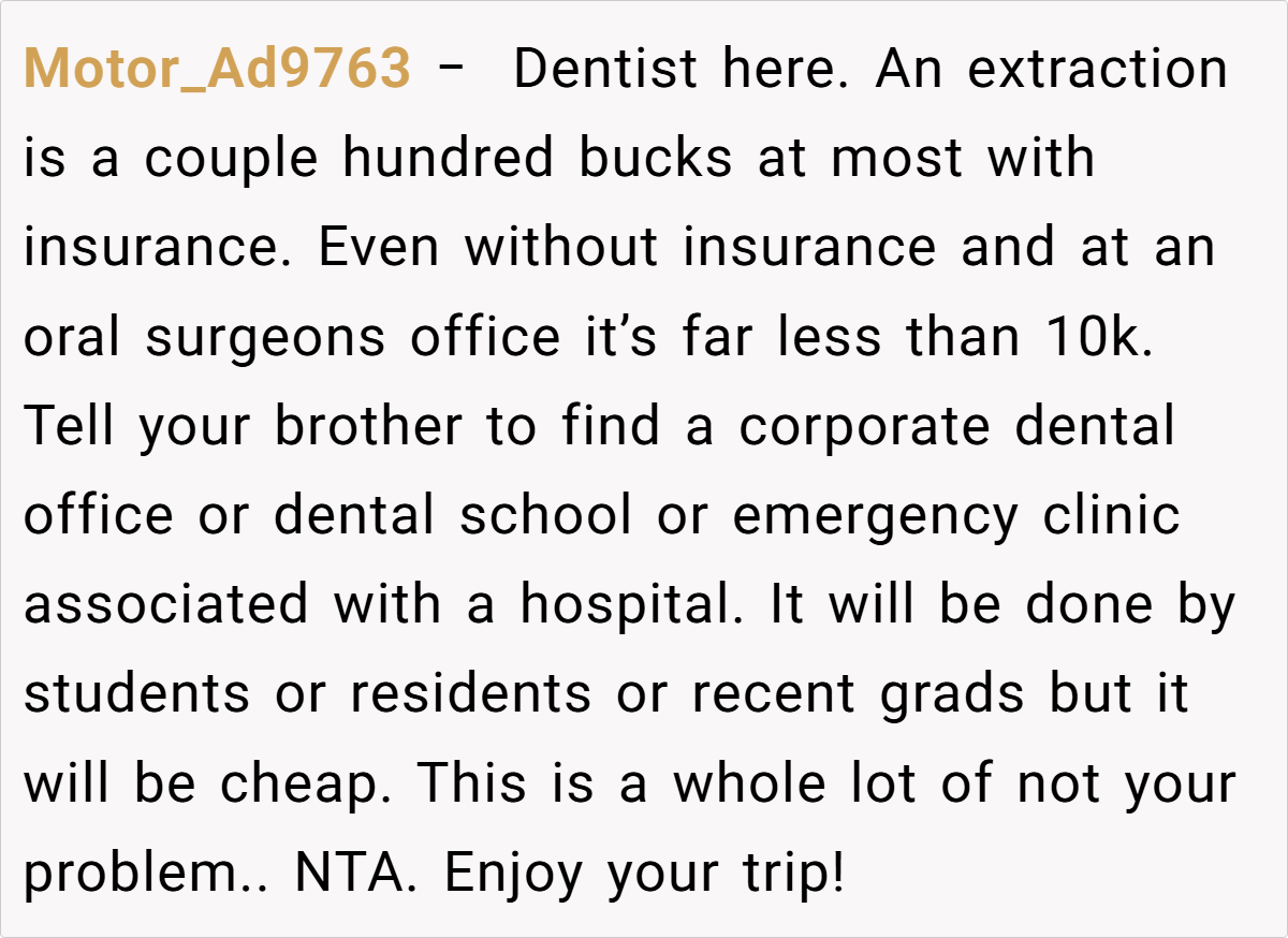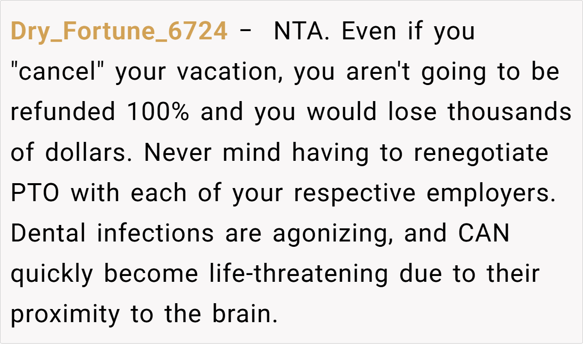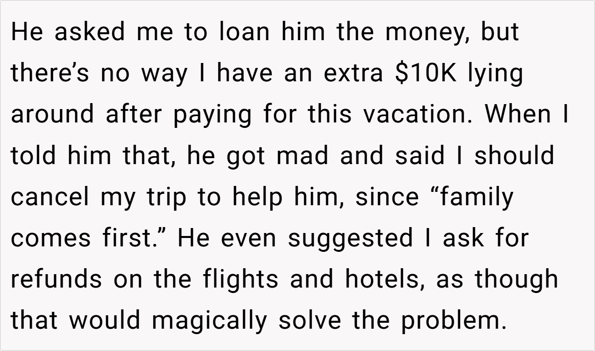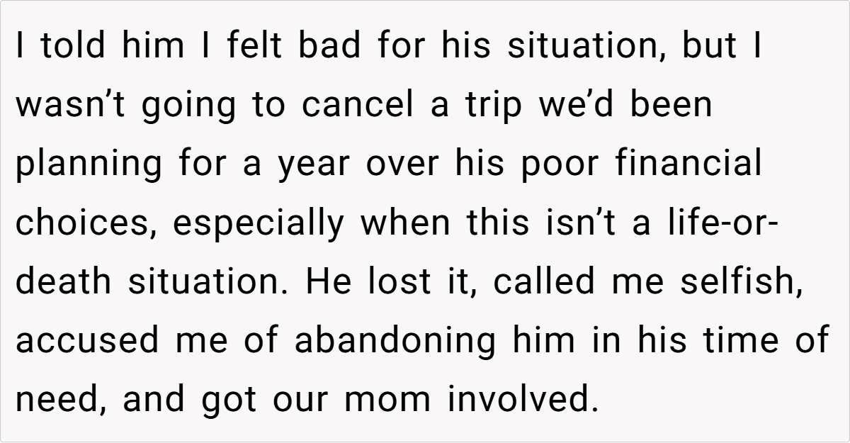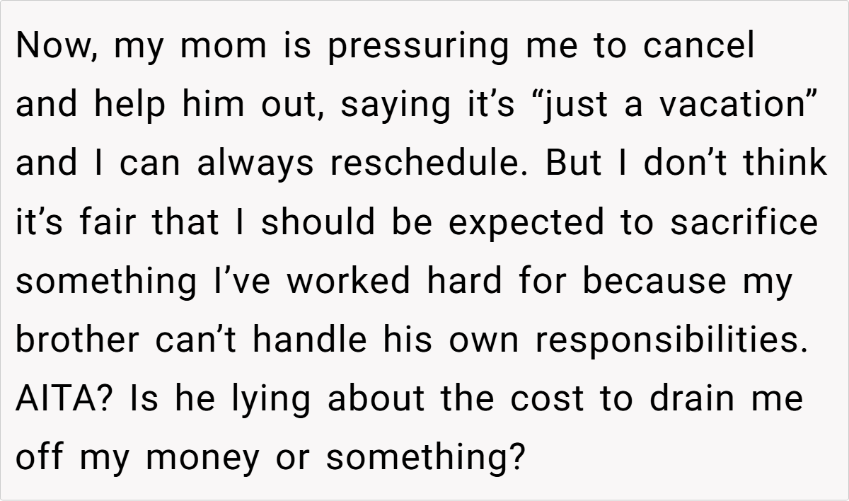 Despite knowing the procedure isn’t life‑threatening, her brother insists that “family comes first” and demands that she cancel her trip to help him out. With her flights and hotels already paid for, she simply doesn’t have the extra cash to cover his expenses. Now, not only is she being called selfish by her brother, but her mom is also pressuring her to sacrifice her dream vacation.