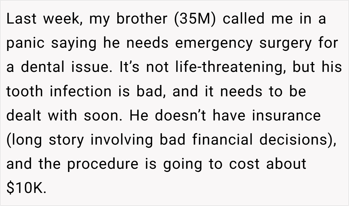 When you’ve spent a year planning a once-in-a-lifetime vacation, every penny counts—and your hard work is on the line. In this story, a 30-year-old woman describes how her brother’s unexpected dental emergency, which costs around $10K, has thrown her carefully planned European trip into turmoil.