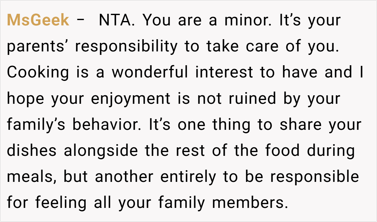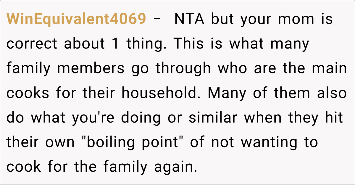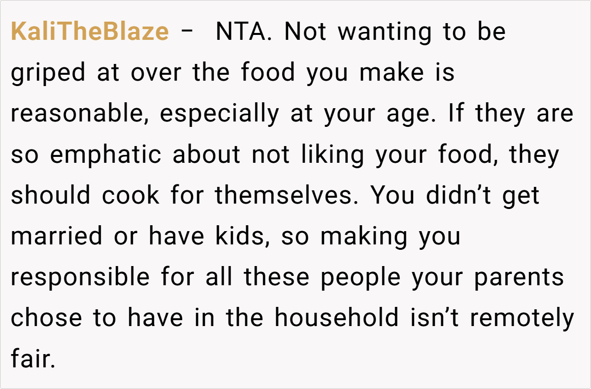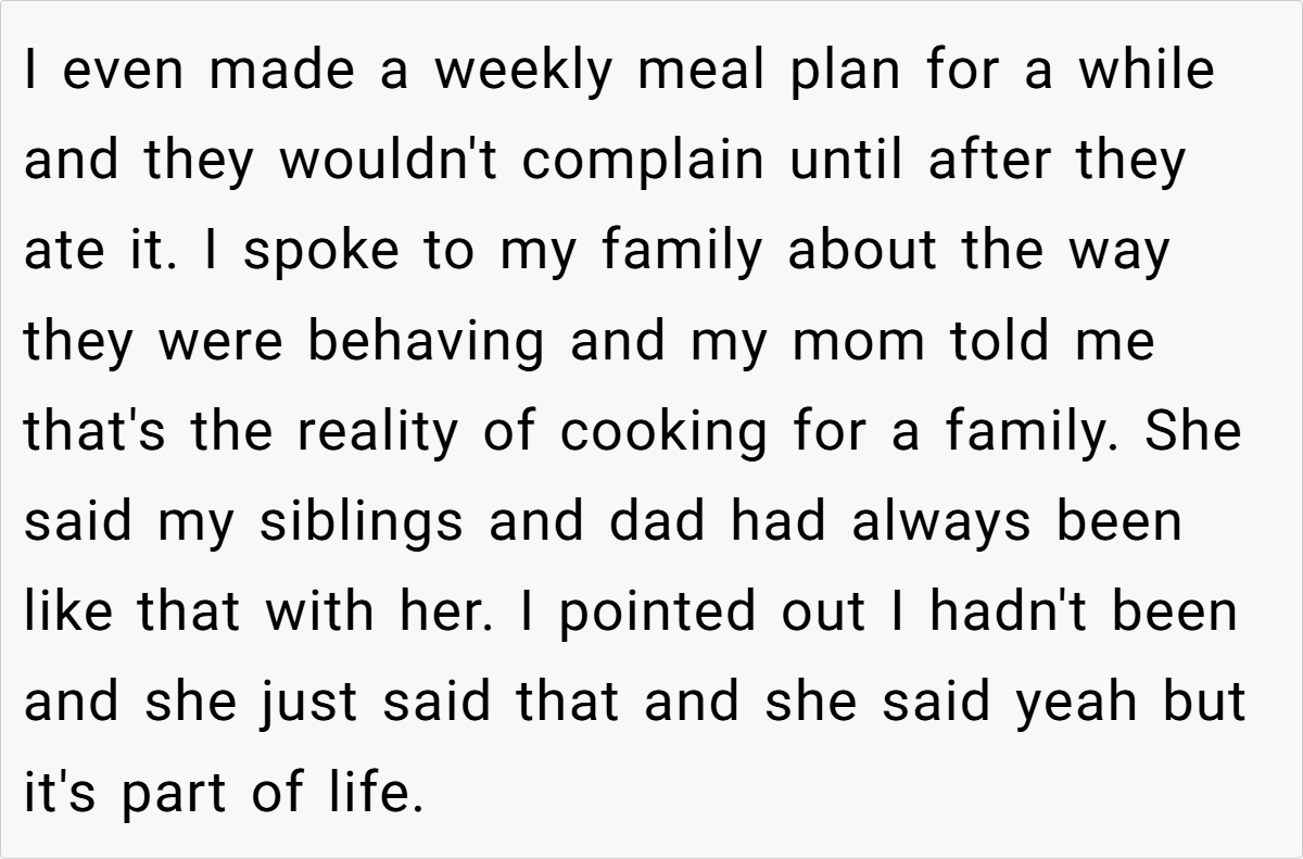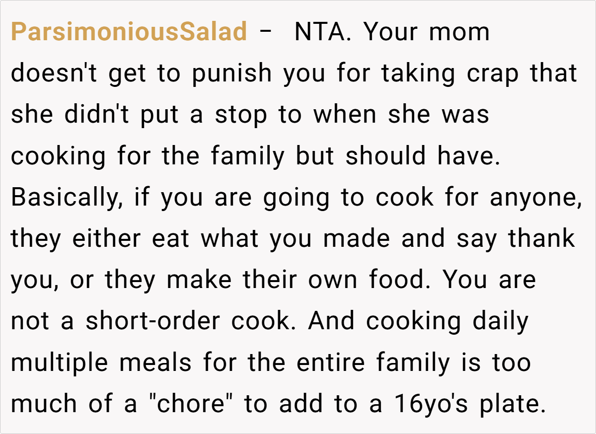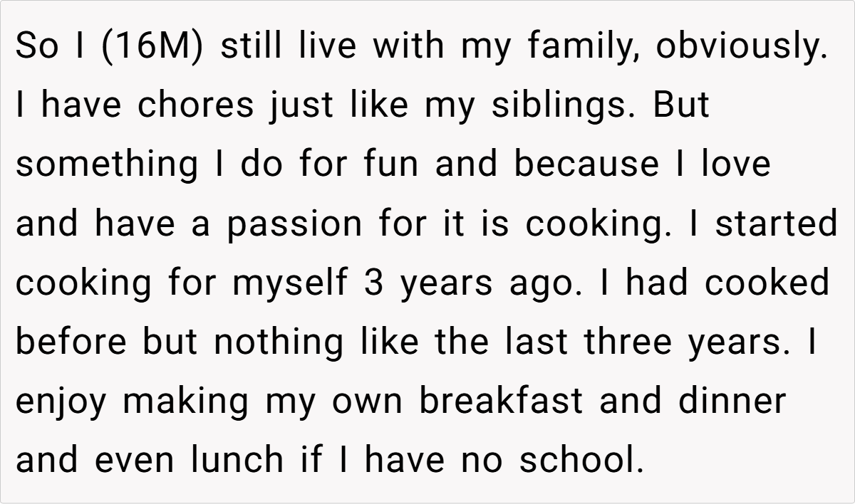 The situation clearly reflects a breakdown in communication and mutual respect. Family meals are meant to be a shared ritual, yet the teen’s passion for cooking turned into a battleground of unmet expectations. His detailed grievances reveal an imbalance where his creative energy was constantly undermined by complaints over trivial details. When expectations aren’t aligned, resentment builds and the simple act of cooking becomes a source of conflict.