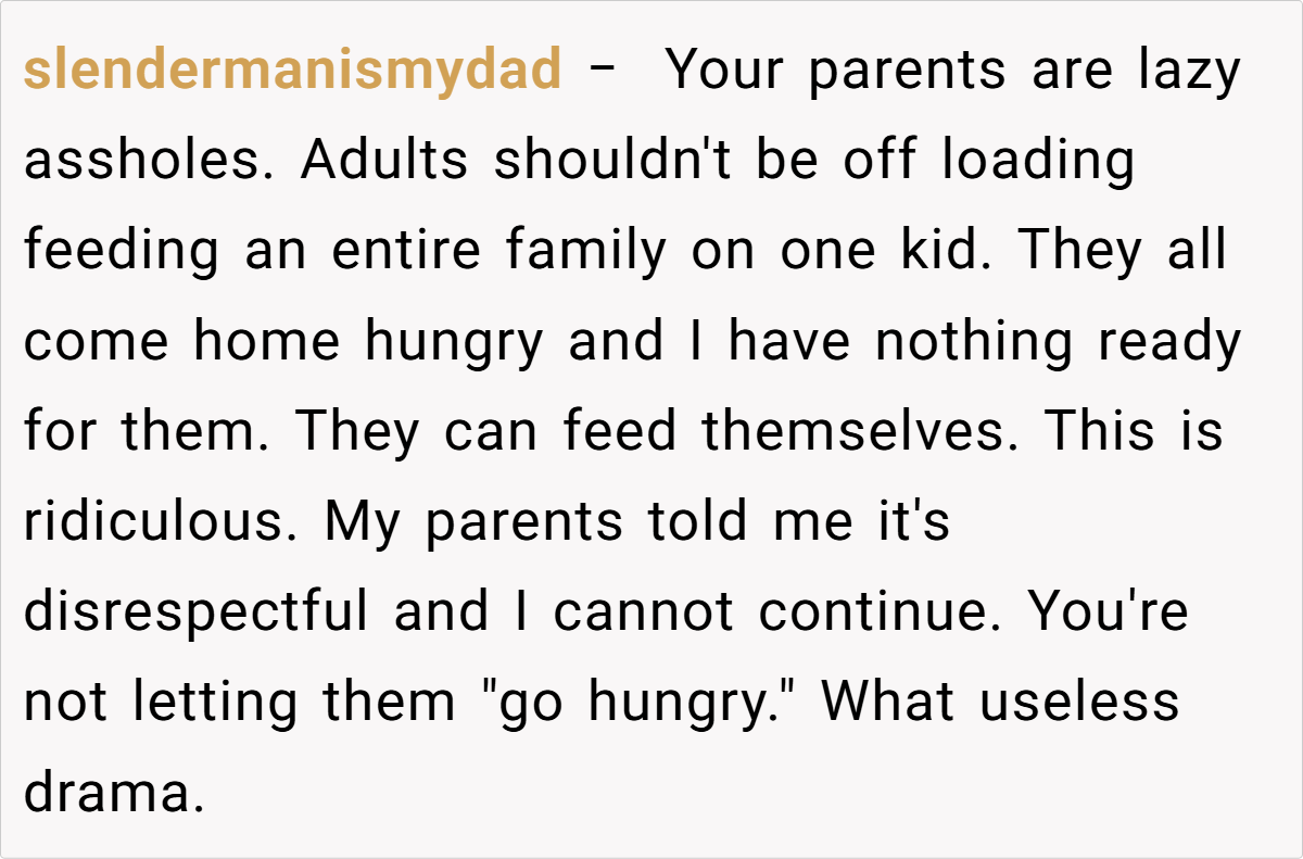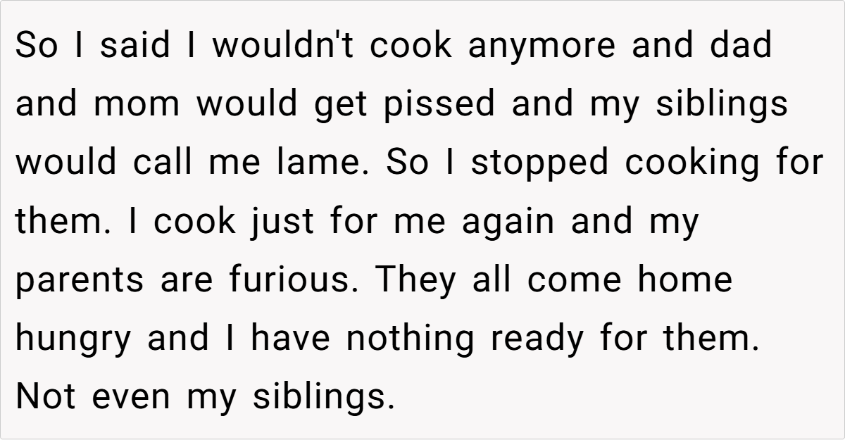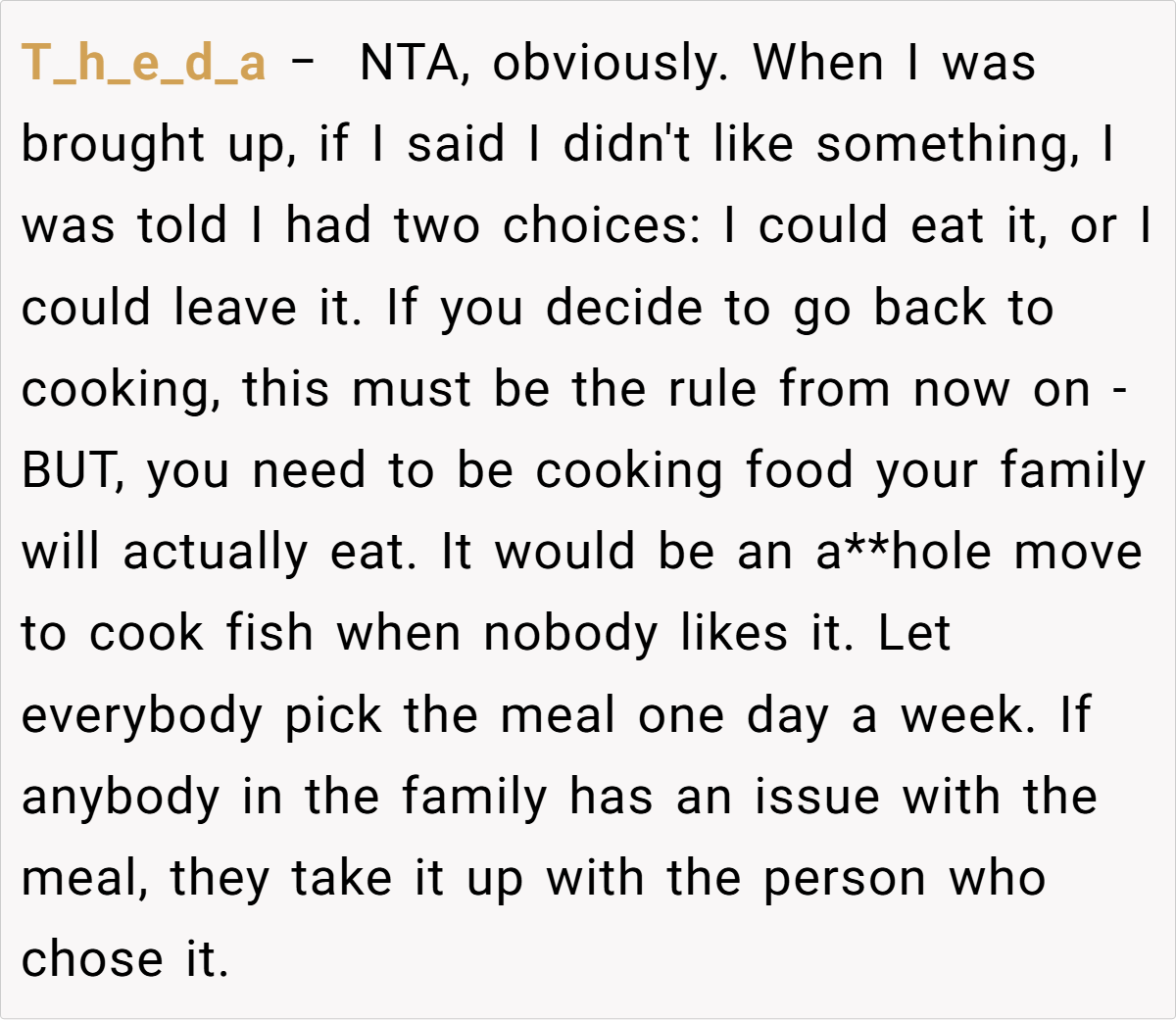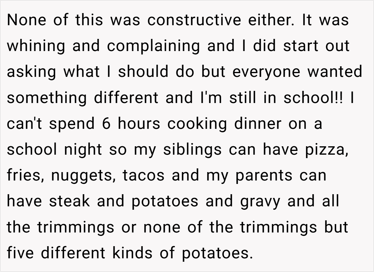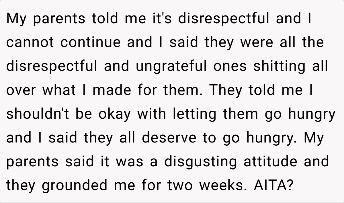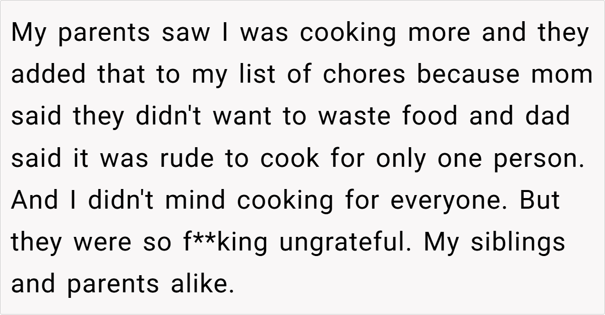 The situation clearly reflects a breakdown in communication and mutual respect. Family meals are meant to be a shared ritual, yet the teen’s passion for cooking turned into a battleground of unmet expectations. His detailed grievances reveal an imbalance where his creative energy was constantly undermined by complaints over trivial details. When expectations aren’t aligned, resentment builds and the simple act of cooking becomes a source of conflict.