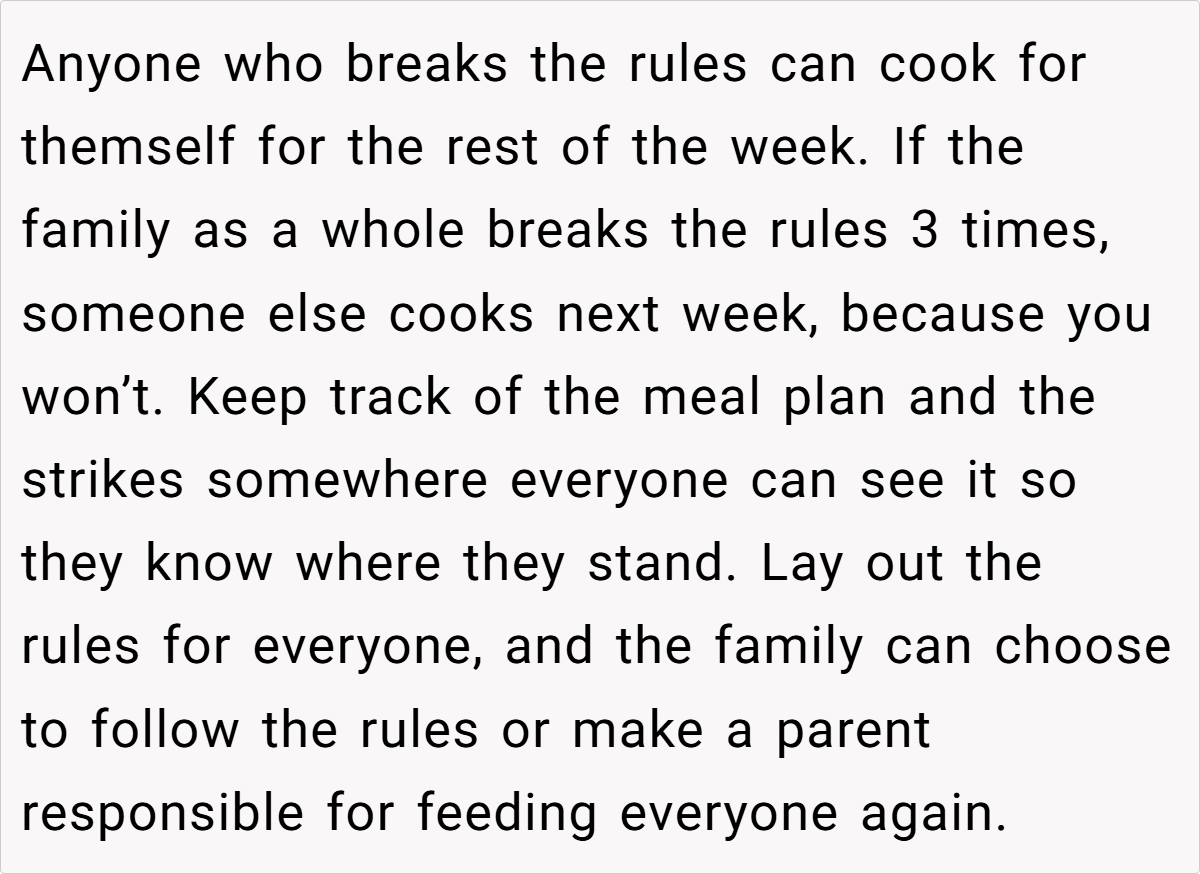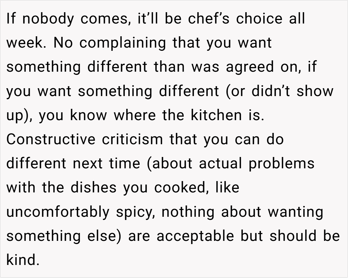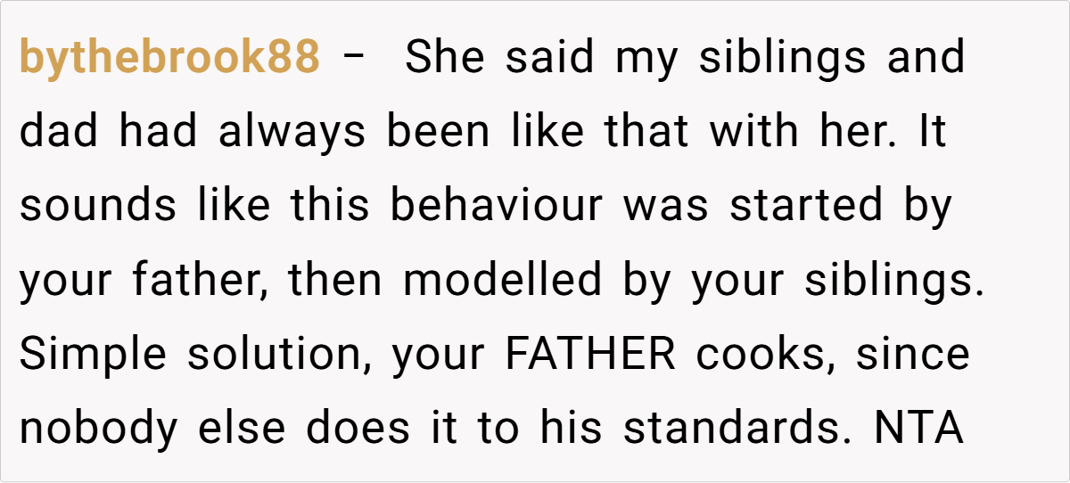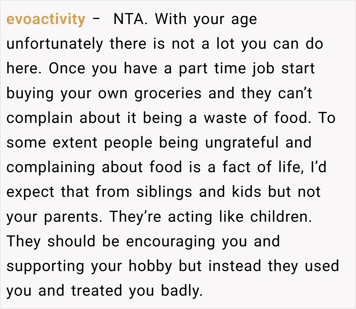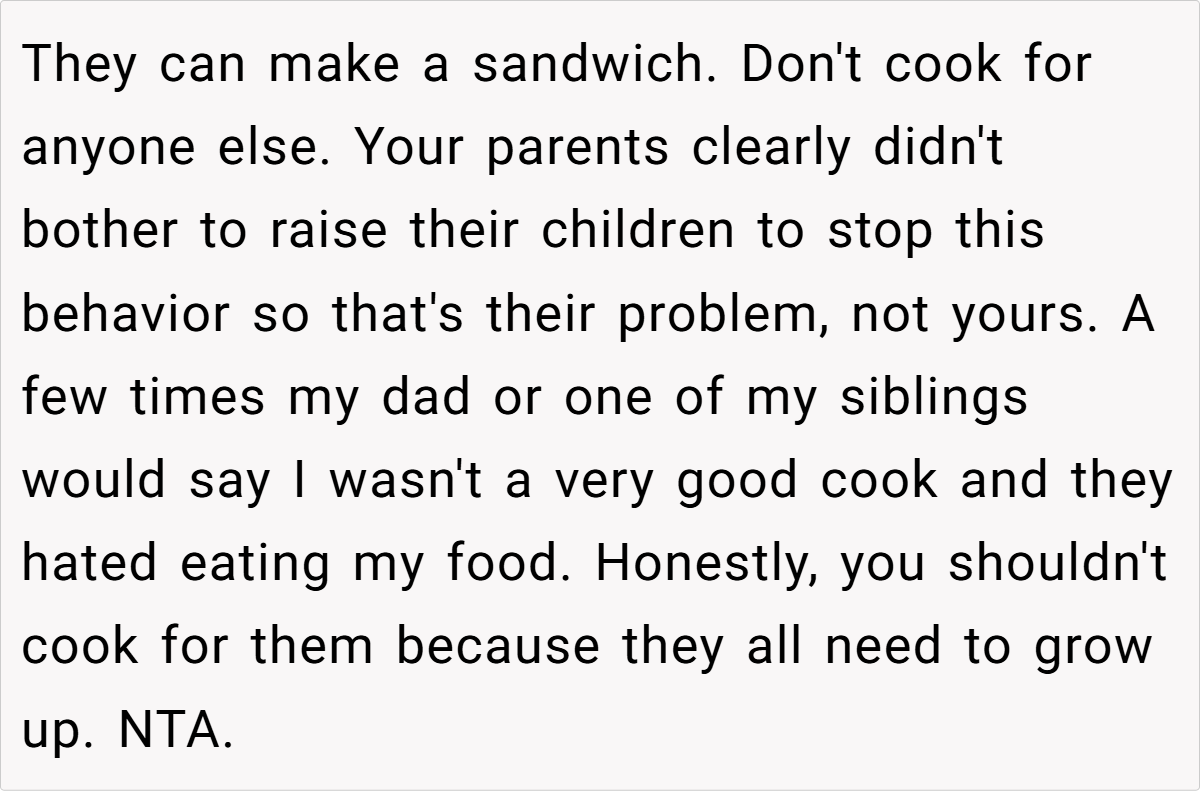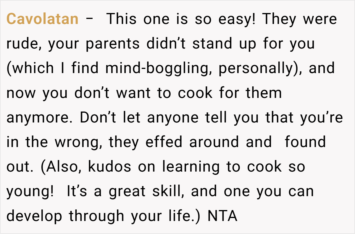 The situation clearly reflects a breakdown in communication and mutual respect. Family meals are meant to be a shared ritual, yet the teen’s passion for cooking turned into a battleground of unmet expectations. His detailed grievances reveal an imbalance where his creative energy was constantly undermined by complaints over trivial details. When expectations aren’t aligned, resentment builds and the simple act of cooking becomes a source of conflict.
