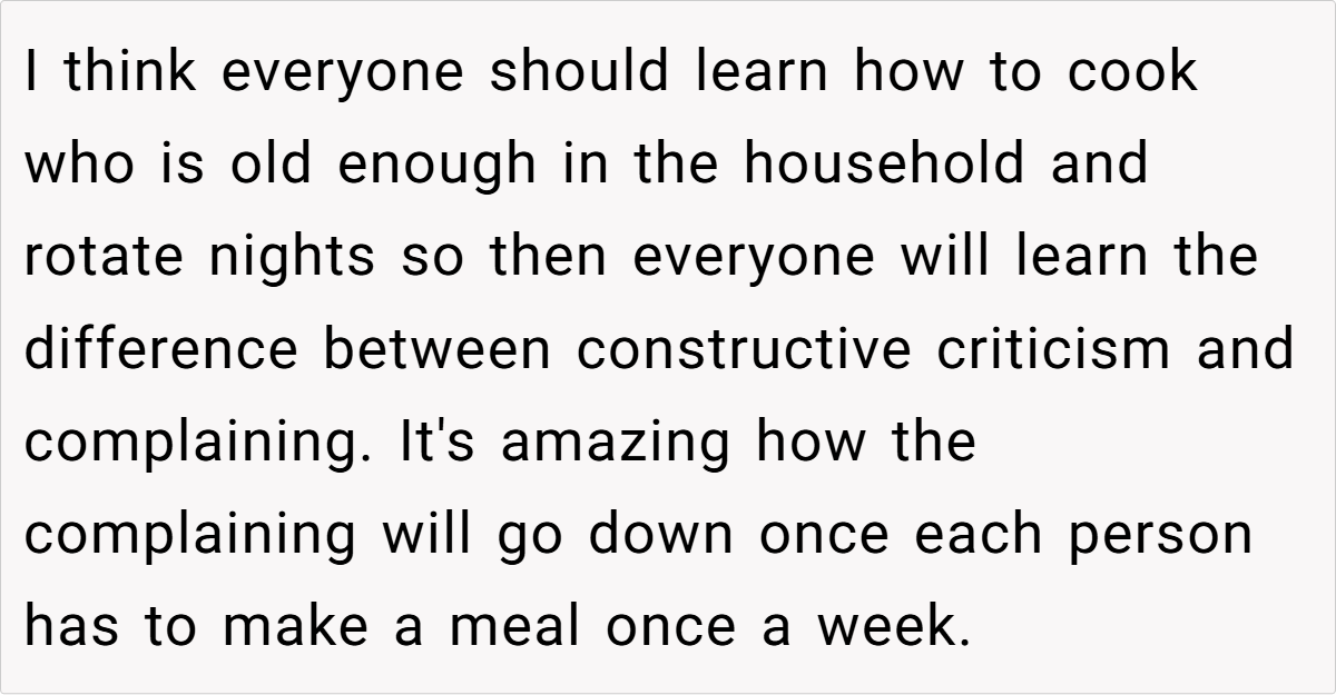 Overall, Reddit users expressed a mix of sympathy and humor towards the situation. Many agreed that the teen’s frustration was understandable given the constant, unconstructive criticism he received from his family. Commenters emphasized the need for mutual respect and constructive feedback in family dynamics, suggesting that both the cook and his family could benefit from better communication and appreciation of each other’s efforts. The consensus was that balancing criticism with positive reinforcement is essential for healthy relationships, even within families.