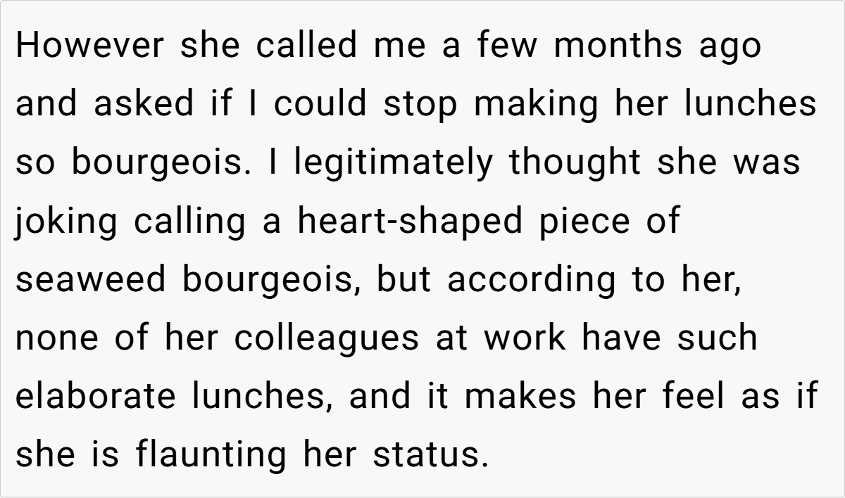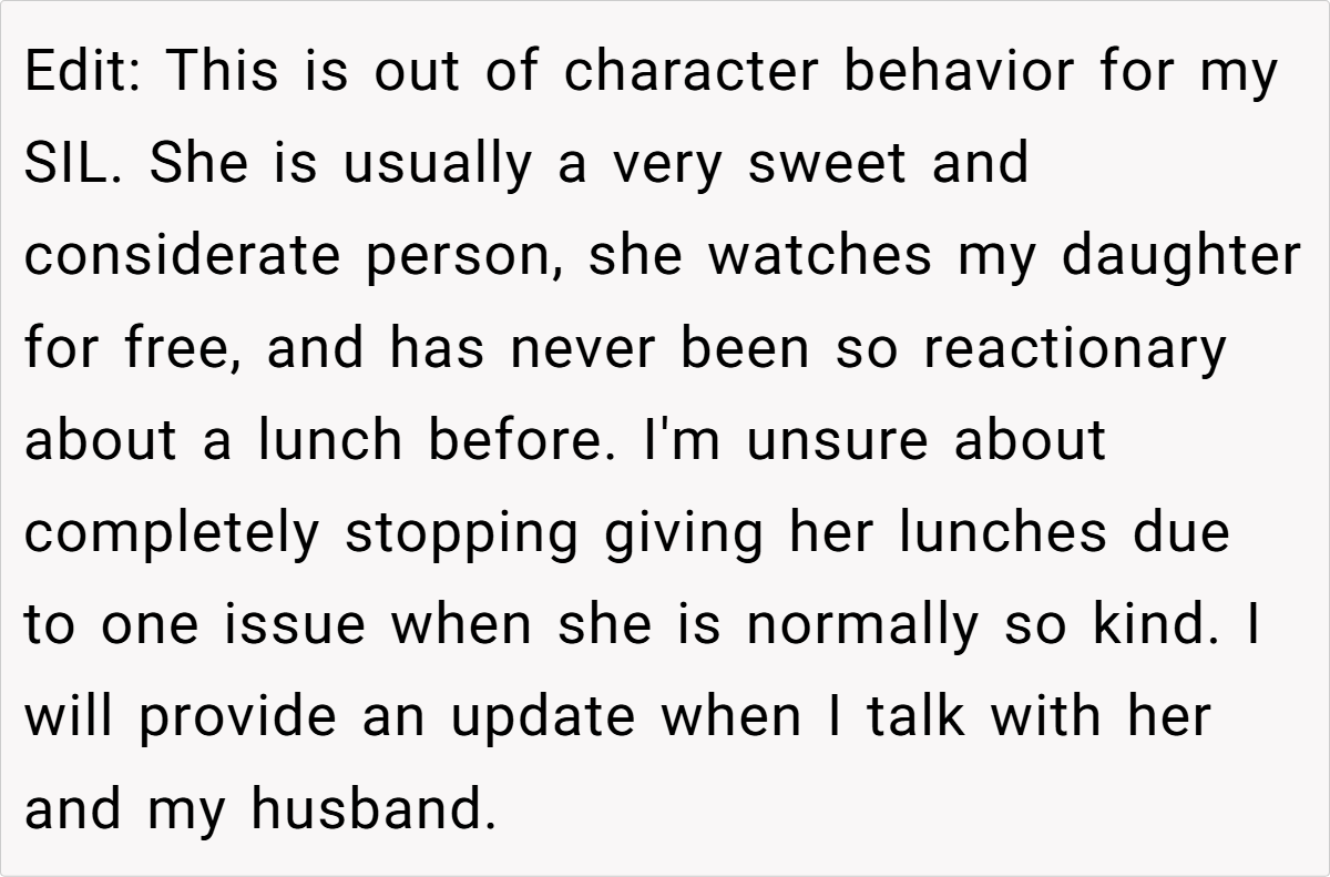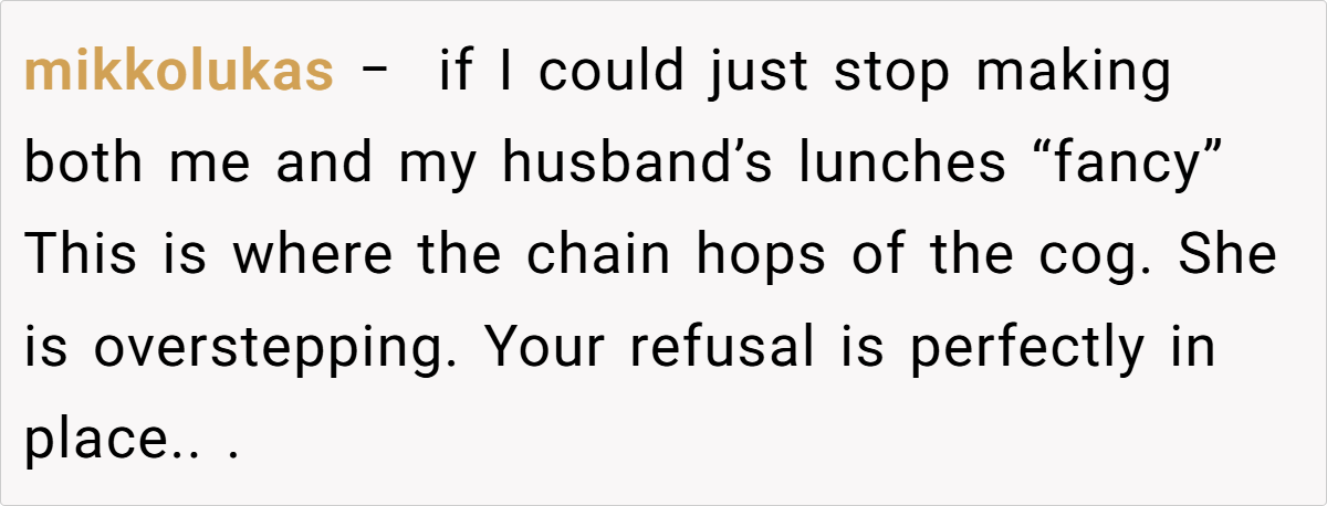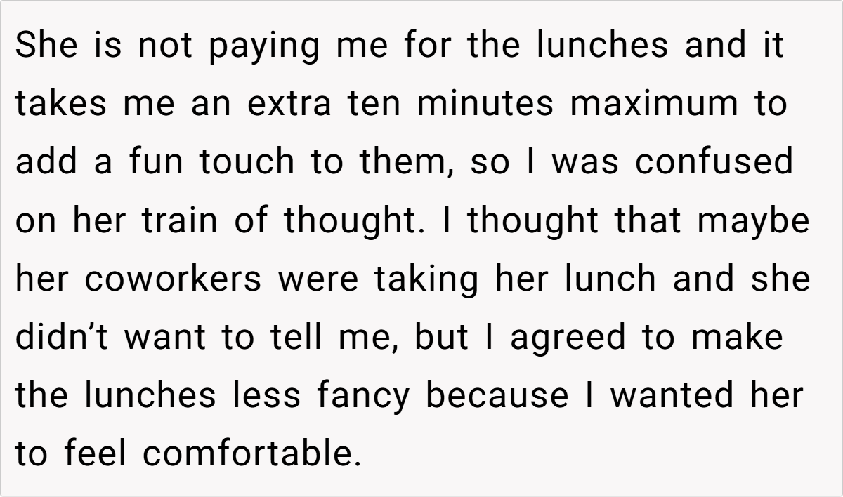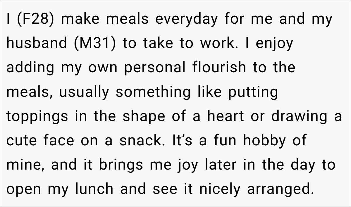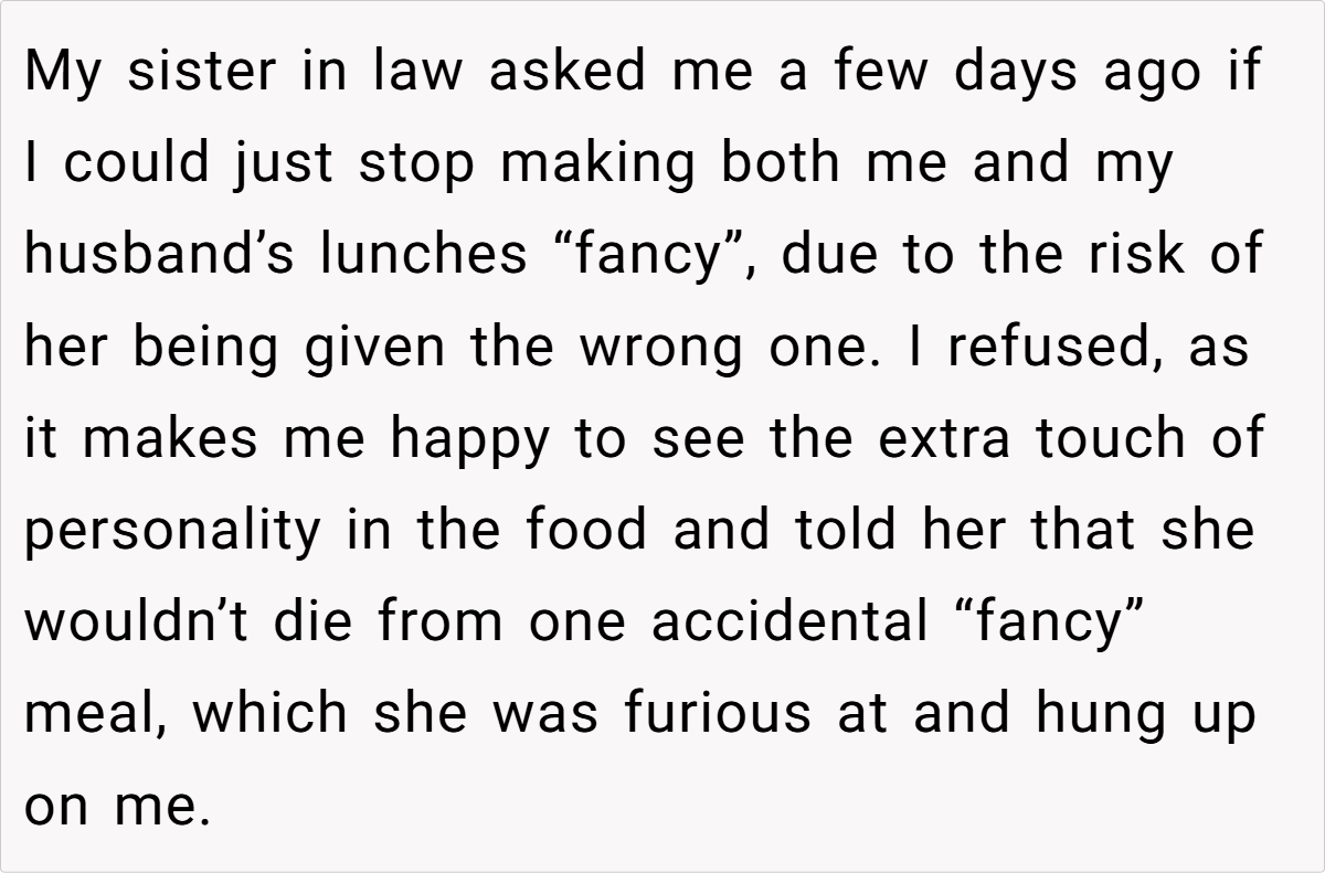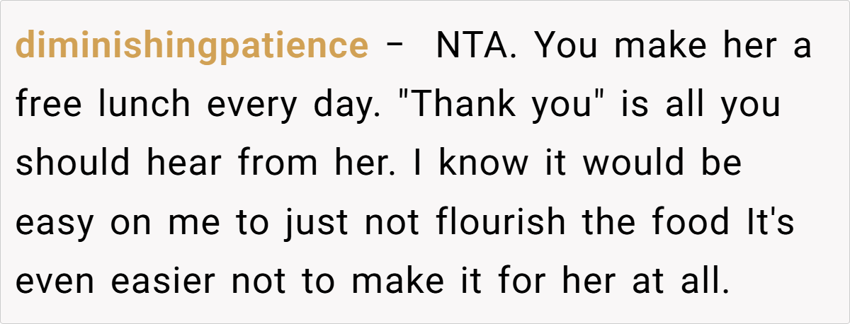 Creative expression in everyday tasks—like lunch preparation—can be a delightful way to show care. Yet, when personal touches intersect with sensitive emotions, even the simplest acts can stir unexpected controversy. In this case, the sister-in-law’s reaction appears rooted in feelings of inadequacy or social pressure. Sometimes, what one person sees as a kind gesture, another may perceive as an unwelcome display of privilege, especially in challenging times.
