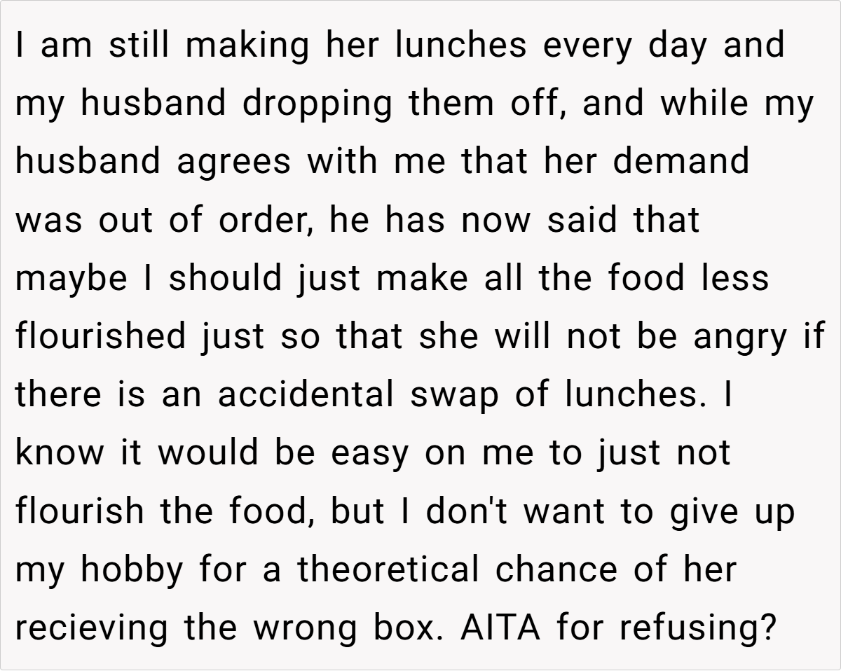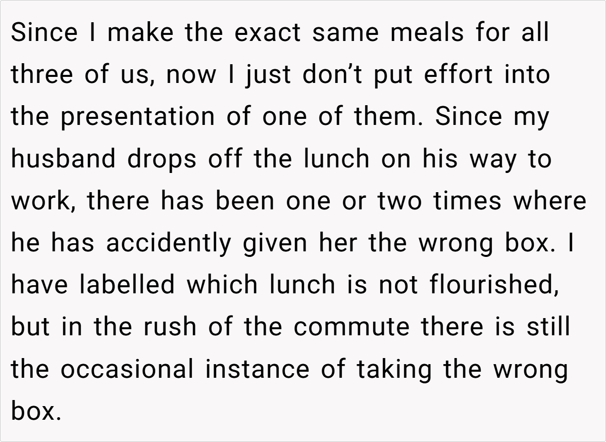 Moreover, practical solutions can often bridge the gap between differing expectations. For example, using distinct lunch boxes or color-coded labels might eliminate accidental mix-ups, ensuring that each meal reaches its intended recipient without compromising the creative flair that brings joy. This small adjustment can help maintain the spirit of the gesture while respecting personal boundaries and preferences, ultimately fostering a more harmonious environment.