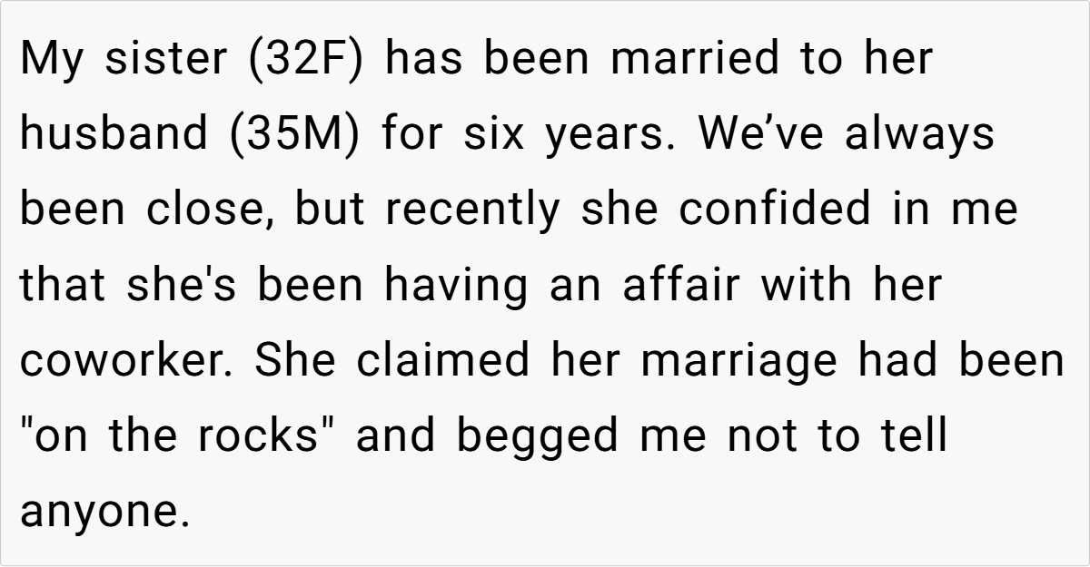 Family bonds can be strong, but should they extend to covering up a betrayal? That’s the dilemma OP found themselves in after their sister (32F) confided in them about her affair—then expected them to keep it a secret.