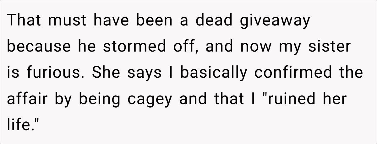 But secrets don’t stay hidden forever. When the husband (35M) came knocking, OP tried to stay neutral, but their reaction spoke volumes. Now, the sister is furious, the parents think OP should’ve protected her, and OP is left wondering: Did they really “ruin” their sister’s life, or was that her doing?